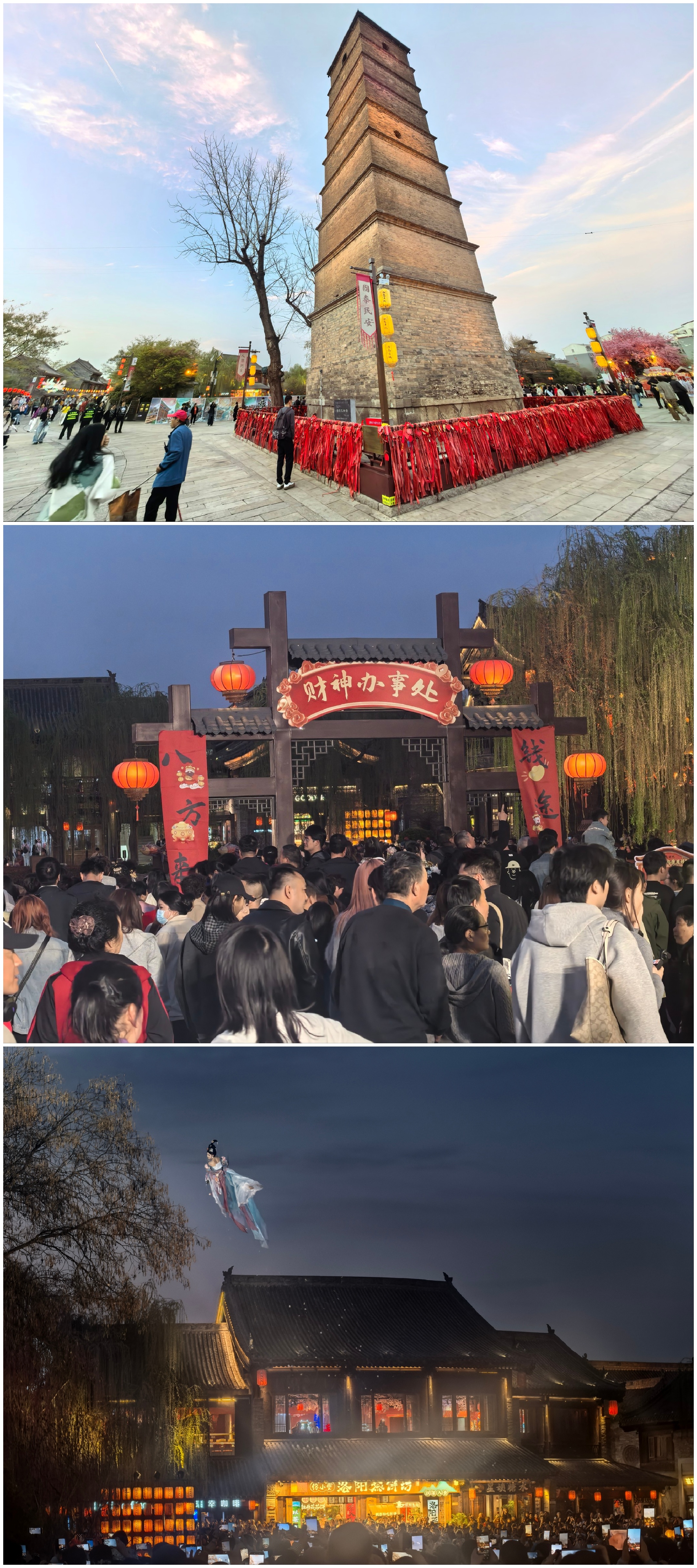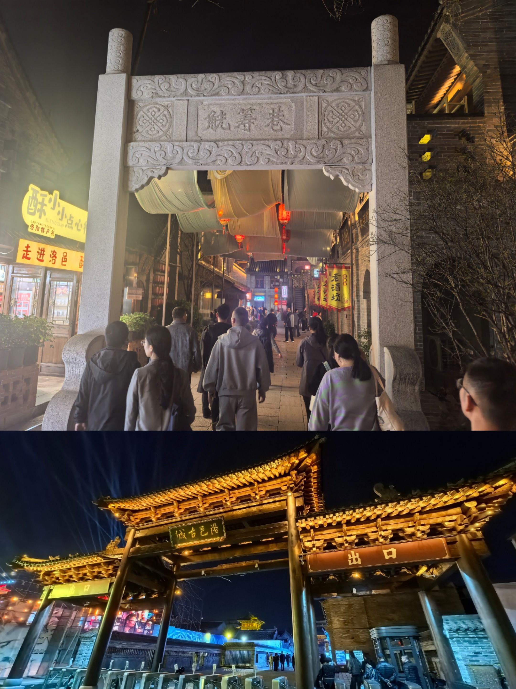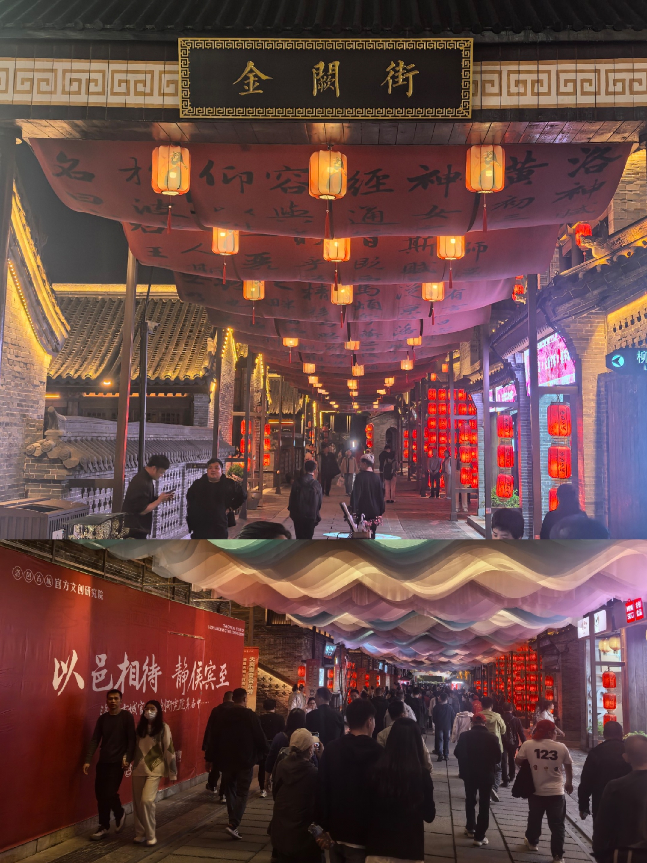 夜游洛邑古城,天女散花飘洒而下,国潮文创琳琅满目,街边小吃热气腾腾,灯火映着青砖