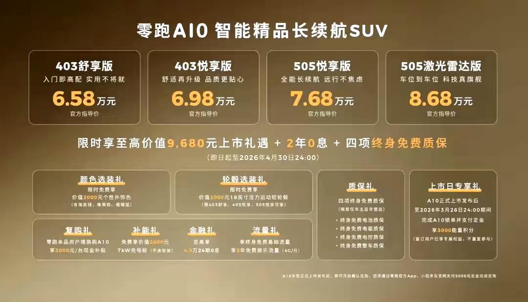 价格屠夫,零跑A10,售价6.58万~8.68万。 零跑A10上市了,定位小型SUV,车身尺寸4270x1810x1635mm,轴距2605mm。 低配39.8度电池包,续航403公里,售价6.58万起。 高配53度电池包,续航505公里,售价7.68万起。 这样的尺寸,这样的配置,这样的价格,竞争对手麻烦了。 比亚迪元UP,7.48万~11.98万。 长安启源Q05,7.99万~10.99万。 不光同级别的SUV受影响,小型电车也被一顿乱杀。 吉利星愿,6.88万~9.88万。 比亚迪海鸥,6.98万~8.58万。 五菱缤果S,6.68万~8.98万。 极狐T1,6.28万~12.58万。 这个级别的消费,对价格极度敏感,几千块钱的差价,就能扭转消费习惯。 零跑A10,电池包和续航有很大的优势,小型电车要迎来一场血雨腥风了。