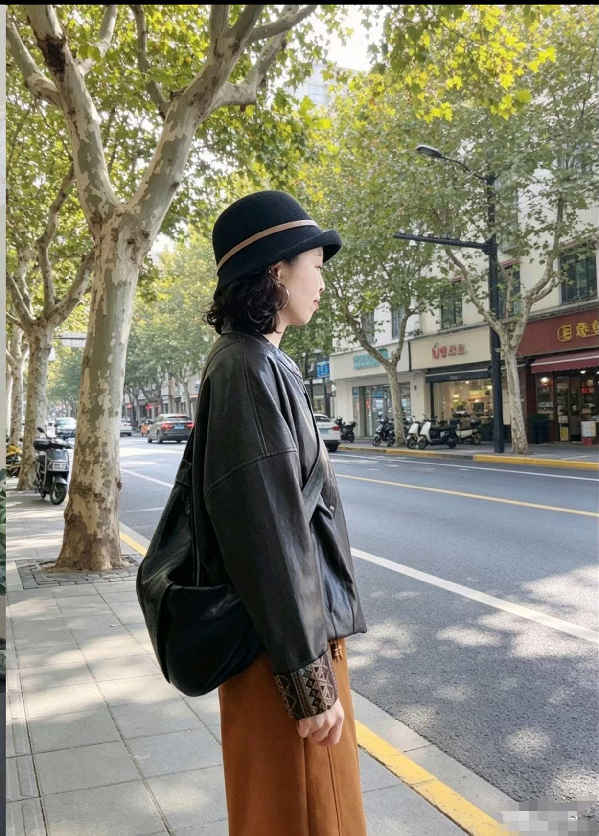 这套是复古轻熟甜酷风,核心是棕调皮质外套+闪钻短裙的搭配:皮质外套自带复古质感,
