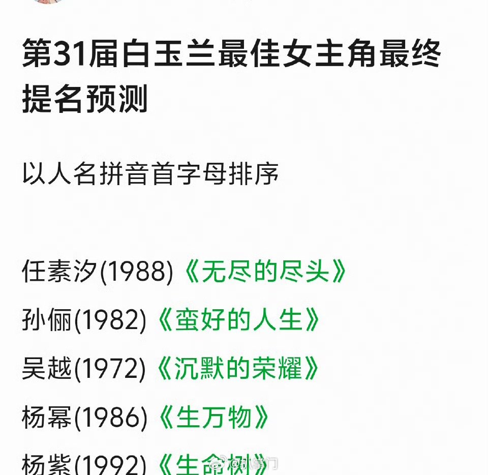 2026白玉兰视后提名最终预测2026白玉兰也是要神仙打架了吧,网友提名了视后的最终预测,任素汐、孙俪、吴越、杨幂、杨紫。五位女演员主演的电视剧口碑和热度拉满,一时间不知该pick哪位了啊,坐等开奖吧~2026白玉兰视后入围预测