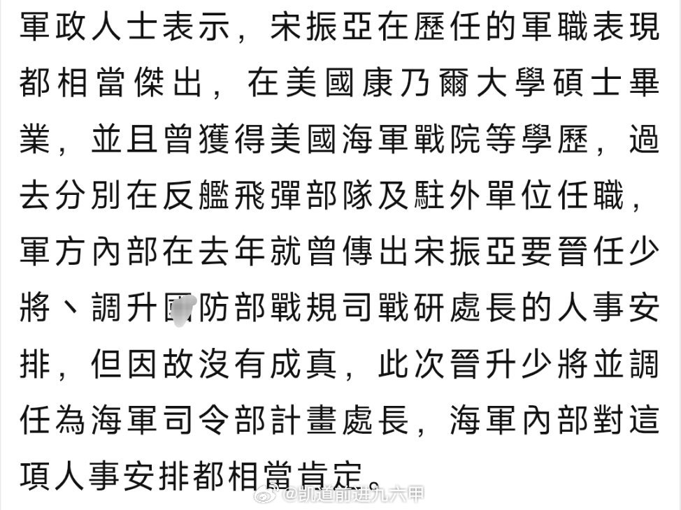 台海局势 台伪军海锋第二大队大队长宋振亚上校晋升少将军衔,升任伪海军司令部计划处长,主管伪海军未来兵力整建计划与管制,以及对外军事交流。