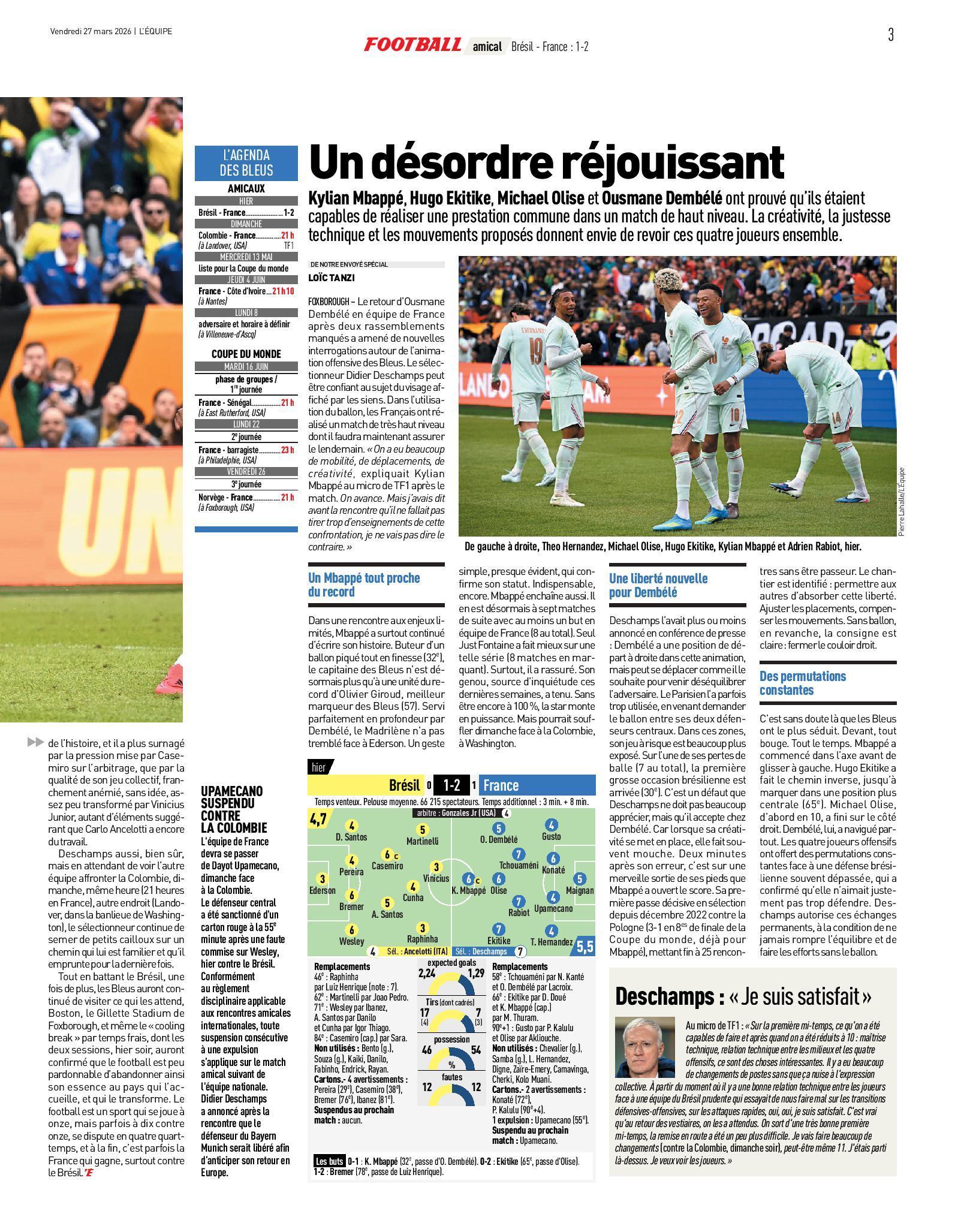 今日队报:《法国在世界杯备战中击败巴西;姆巴佩精彩挑射破门首开纪录,距离纪录仅差一球》