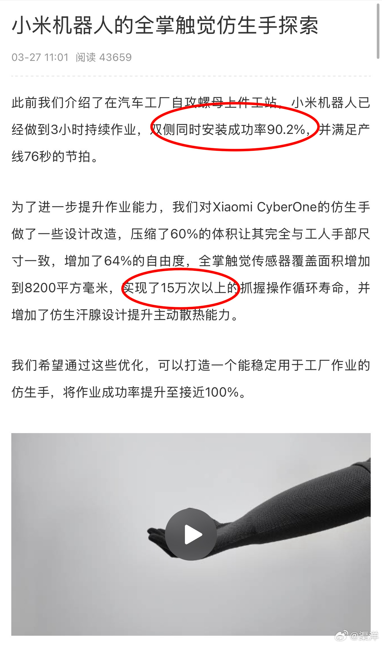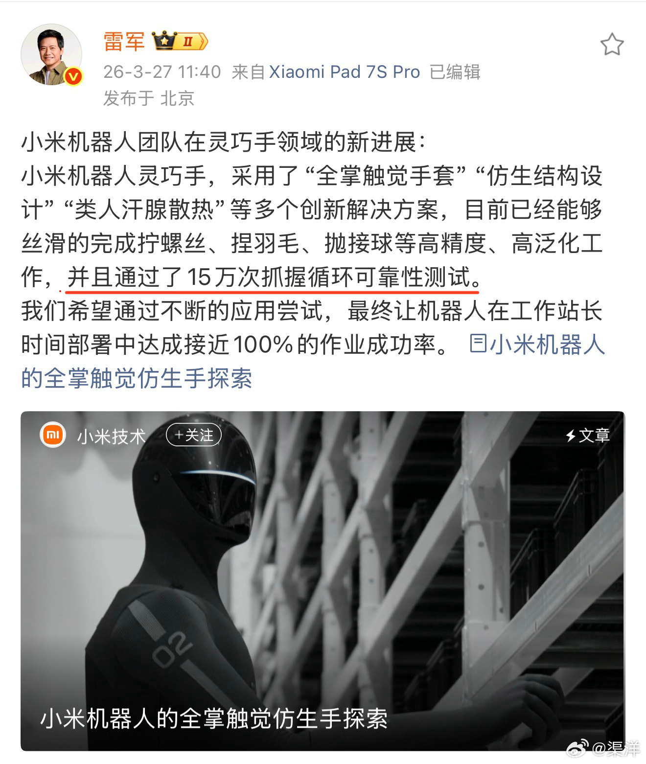 小米机器人灵巧手解决方案首次公开 小米这次的灵巧手真的说到点子上了,直接解决机器人进工厂最难的问题!全掌触觉手套设计特别实用,机器人能精准干活,人戴上还能快速收集训练数据,又省钱效率又高。可靠性也拉满,能抓握15万次,不管是工厂拧螺丝,还是捏羽毛、抛气球都轻松搞定。之前小米机器人就已经在汽车工厂连续作业3小时,安装成功率超90%。这次灵巧手再升级,大小跟人手一模一样,手感、灵活度、散热和耐用性全面提升,把技术和成本的门槛都打通了,以后机器人替人干脏活累活,真的越来越近了。