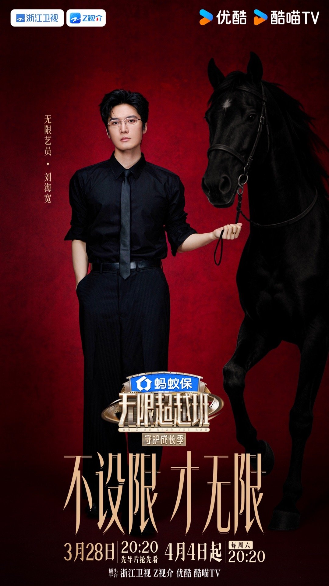 刘海宽拒绝吃陈情令老本 刘海宽官宣加盟《无限超越班4》,黑衬衫领带眼镜look,一手牵着黑马,官宣海报气场直接拉满,打破标签用实力演绎,期待刘海宽在节目中的表现啊!