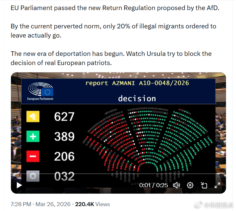 欧盟议会通过了由德国选择党(AfD)提出的新遣返条例。