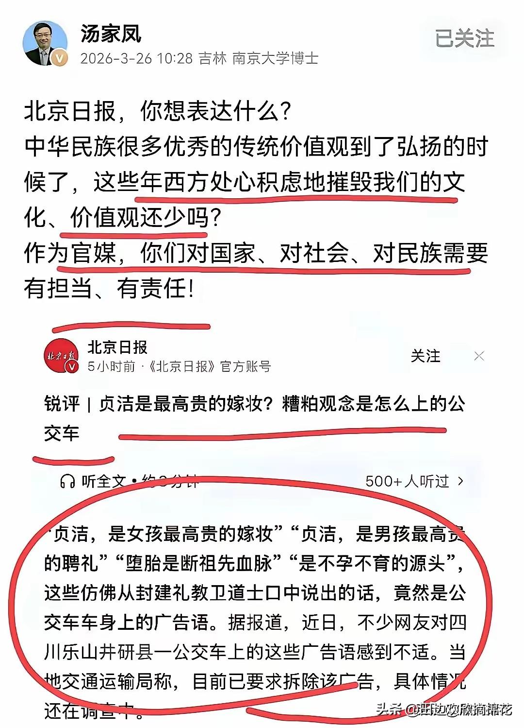 汤家凤怒怼官媒:官媒应该是弘扬社会主义价值观和优秀传统文化的阵地,洁身自好,遵守最起码的伦理道德和公序良俗,这是不是糟粕,这恰恰是我们文明的标志!官媒还有一个重要的职责,就是重要的舆论阵地,反对外来不良和有毒文化的渗透!我希望你们能够负起最起码责任! 这话糙理不糙!作为考研界的“硬核名师”,汤家凤这次跨界发声,没有半句虚头巴脑的客套,字字戳中舆论场的痛点。很多人只盯着他“怒怼”的姿态,却没读懂背后藏着的历史逻辑——守好文化根脉、守住舆论阵地,从来都是中华民族走过百年风雨悟出来的硬道理。 翻开近代史,哪一次民族危亡,不是先从文化渗透开始?晚清洋教泛滥,不少人被洗脑成“精神殖民地”,才有“多一个基督徒,少一个中国人”的悲叹 ;抗战时期,日寇搞奴化教育,妄图磨灭中国人的文化记忆,可中华儿女硬是靠《新华日报》《大公报》撑着文化脊梁,用民间读物、战地演剧守住精神家园 。历史早就证明:舆论阵地丢了,文化根脉断了,民族就会失去灵魂。 汤家凤说“洁身自好是文明的标志”,这不是守旧,是刻在骨子里的文化传承。从古代官德要求的“清正廉洁”,到近代国粹派“存学救国”的呐喊,再到新时代社会主义核心价值观的倡导,这份对伦理道德的坚守,贯穿了中华五千年文明 。可偏偏有人把这份坚守曲解成“糟粕”,把外来有毒文化当成“潮流”,颠倒黑白的论调,才是真正该警惕的。 更让人揪心的是,部分官媒忘了初心。本该是弘扬传统文化、传递主流价值的主阵地,却偶尔出现跟风炒作、曲解传统、过度迎合西方碎片化价值观的情况。比如把传统伦理简单贴上“封建”标签,把外来低俗文化包装成“多元包容”,久而久之,不仅模糊了大众的文化认知,更让舆论阵地失去了应有的公信力——这,才是汤家凤怒怼的核心! 他不是反对一切外来文化,更不是狭隘的“排外者”。历史上,我们从来都是取其精华、去其糟粕:借鉴西方科学技术推动近代化,吸收进步思想助力革命,但坚决抵制殖民文化、拜金主义等有毒渗透 。汤家凤的诉求,本质上是让官媒回归职责:守得住传统,辨得清是非,挡得住渗透,这才是舆论阵地该有的样子。 作为百万粉丝历史博主,我见过太多文化乱象:有人拿传统节日炒作流量,有人曲解历史典故博眼球,有人把西方低俗婚恋观当成“先进”贩卖。这些乱象背后,正是部分舆论阵地的失守。汤家凤的质问,就像一记警钟,敲醒了那些在文化迷途中迷失的声音——官媒的责任,从来不是随波逐流,而是引领方向。 优秀传统文化不是“老古董”,是我们安身立命的精神根基。社会主义核心价值观,更是与传统伦理一脉相承:“诚信友善”源于“仁义礼智信”,“家国情怀”传承自“修身齐家治国平天下” 。把这些核心价值当成“糟粕”,不仅是对历史的无知,更是对民族文化的背叛。 汤家凤的怒怼,不是个人情绪的宣泄,而是民间对文化坚守的集体呼唤。全网支持他的声音,本质上是大众对“守正创新”文化观的认同——我们不排斥外来优秀文化,但绝不容许有毒文化侵蚀我们的精神家园;我们尊重文化多元,但绝不能丢掉自己的文明根脉。 说到底,舆论阵地是民族文化的“防火墙”。官媒守住了这份责任,就是守住了大众的文化认同,守住了民族的精神脊梁。汤家凤的质问,值得每一个舆论从业者深思:何为初心?何为职责?何为文化坚守? 总结来看,汤家凤的怒怼,核心是呼吁官媒回归“弘扬主流价值、守护文化根脉、抵御不良渗透”的核心职责,绝非狭隘的排外,而是基于历史经验的清醒呐喊。优秀传统文化是文明的标志,不是糟粕;守住舆论阵地,就是守住民族的精神未来。 你觉得汤家凤的质问,戳中了当下舆论场的哪些痛点?你心中的官媒,该如何平衡文化传承与开放包容? 各位读者你们怎么看?欢迎在评论区讨论。