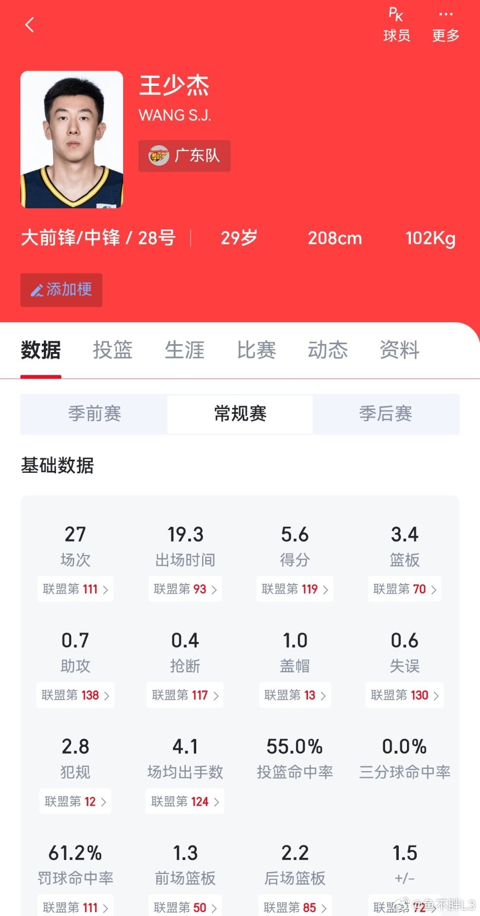 jbq暂离后,广东队国内五号位仅剩王少杰一人。他也是队内第一高度2.08m。如果