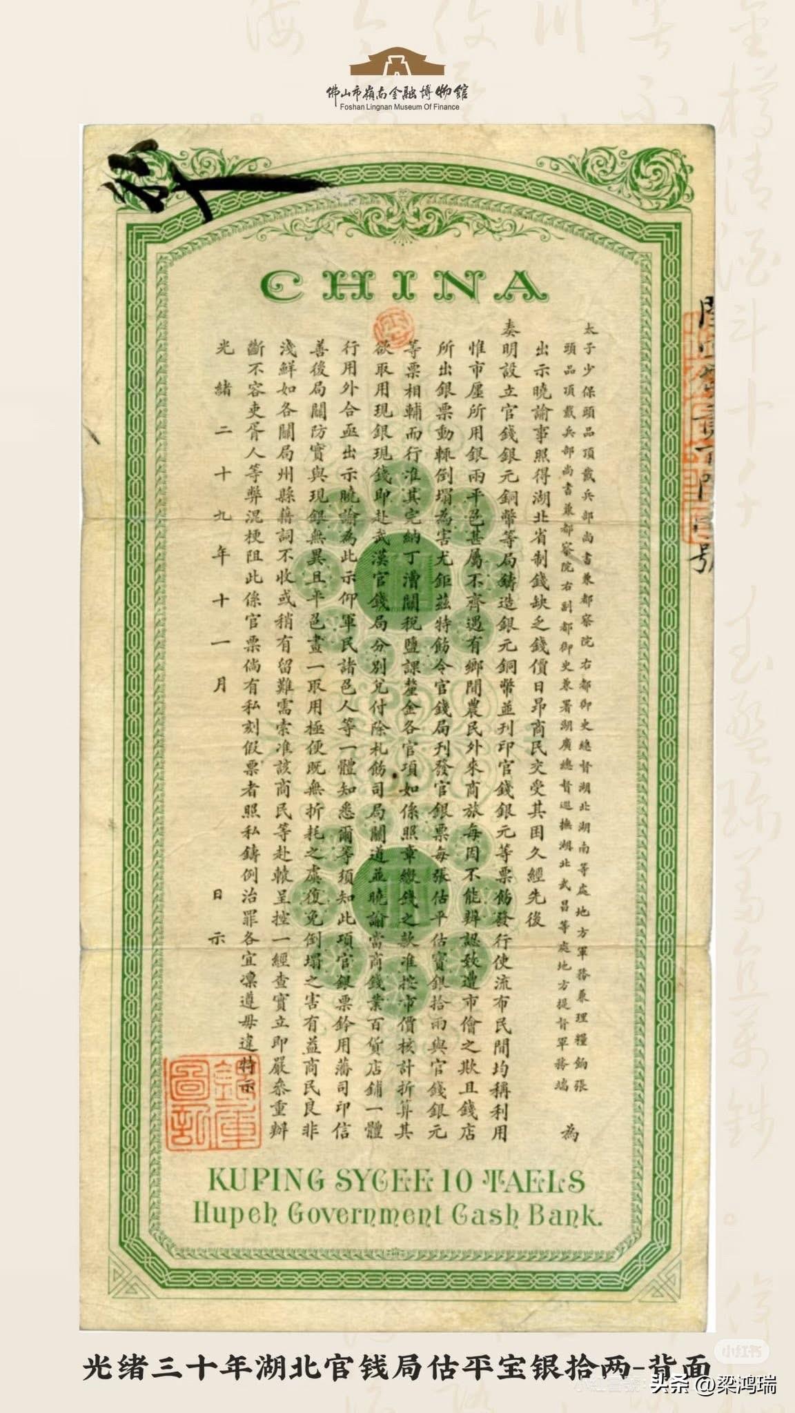 附图展示的是中国钱币史上极具盛名的光绪三十年(1904年)湖北官钱局拾两银票。 该纸币在收藏界享有“三个第一”的美誉:它是中国最早的人物肖像票,也是中国历代钞票中唯一的双人像票,更是唯一一张将满族和汉族官员肖像合印在一起的纸币。 基本背景 发行机构:湖北官钱局。 发行时间:清光绪三十年(1904年)正月。 票面面值:凭票取估平宝银拾两整。 馆藏地点:目前中国钱币博物馆收藏有此票实物,规格约为 187x99 毫米。 肖像人物 票面上方并列的两个椭圆形肖像分别是: 张之洞(右侧):时任湖广总督。 端方(左侧):时任湖北巡抚。 钞票背面印有两人的官职全称。 艺术与收藏价值 设计精美:票面四周花框精致,两侧绘有生动的“双龙戏珠”图案。 稀世珍品:因其独特的双人像设计和历史地位,被视为稀世之珍。早在 2012 年,一枚此类“双像”拾两银票就曾以 117 万元人民币的价格成交,刷新了当时中国单枚纸币的拍卖纪录。