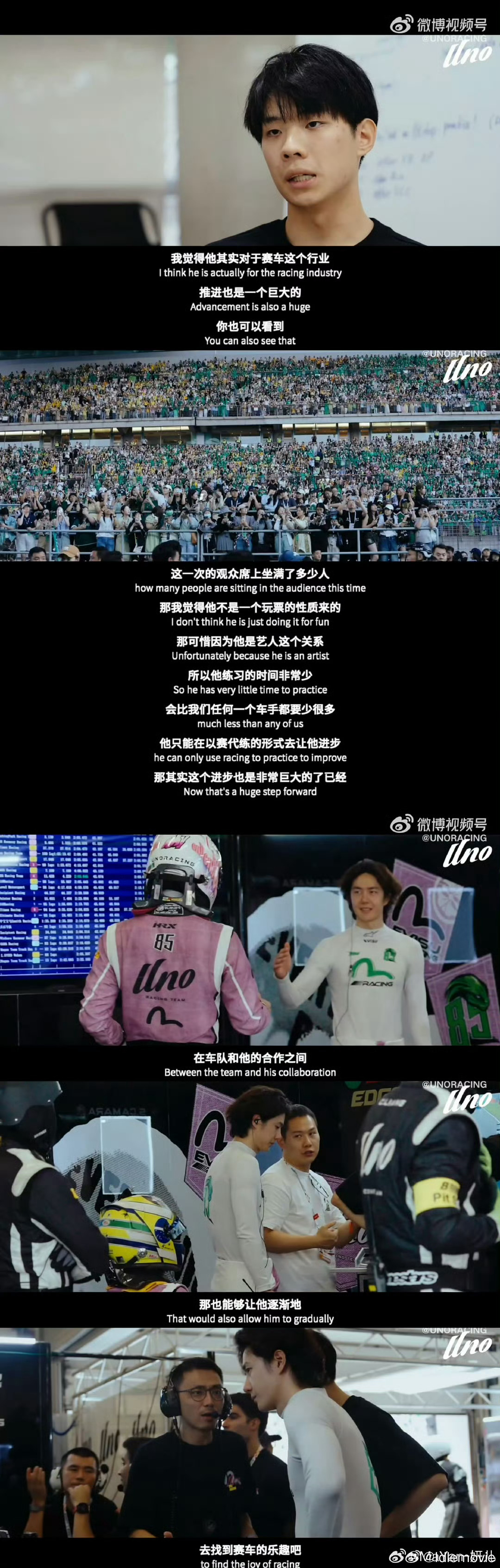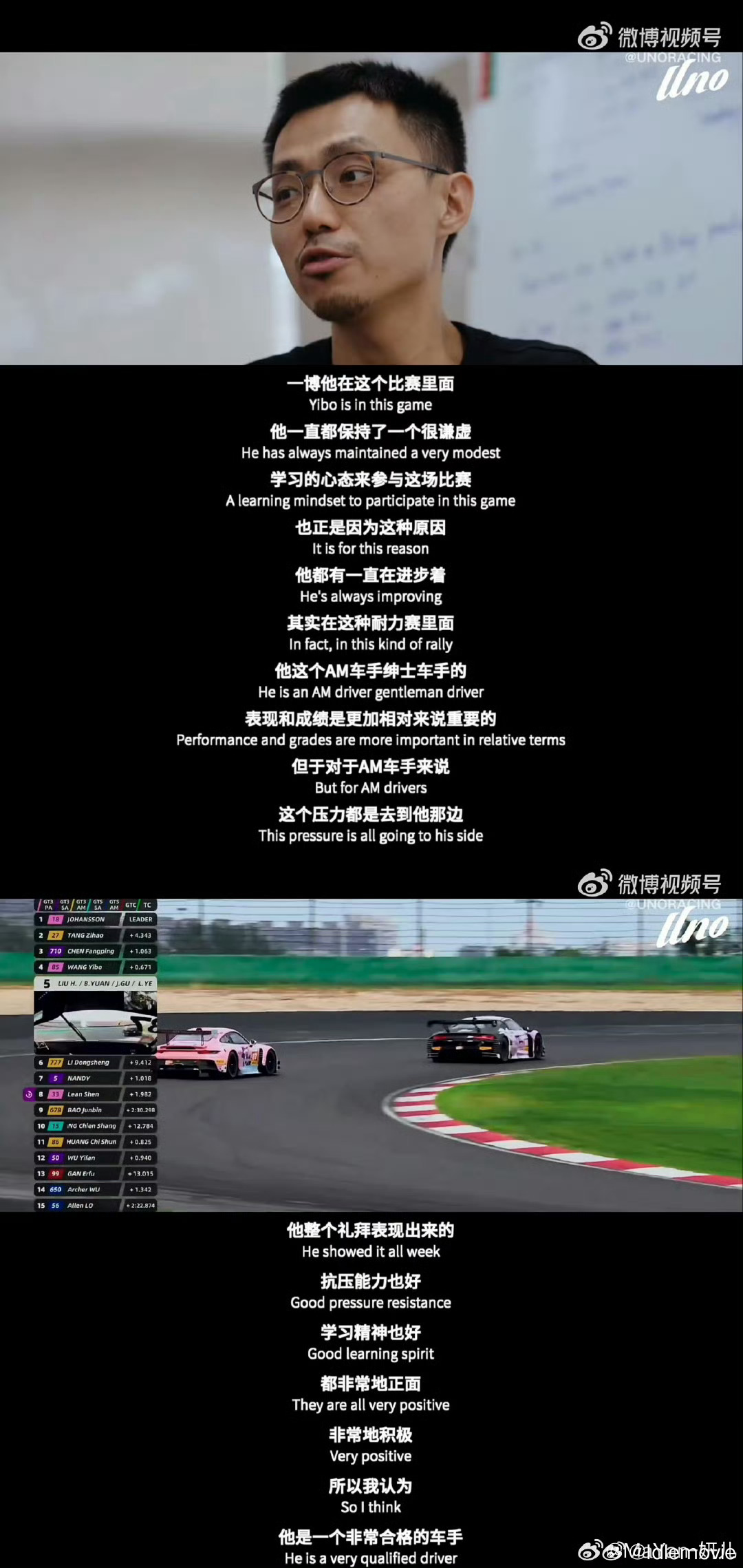 有四点,一是说一博进步非常快,二是非常谦逊,学习精神、抗压能力都非常强,是合格的车手,大家的榜样,三是推动了赛车这个行业,让每场比赛座无虚席,也从不是玩票性质,合作亲密无间,四是王一博虽然是名歌手和演员,但同时也是名有能力的赛车手。