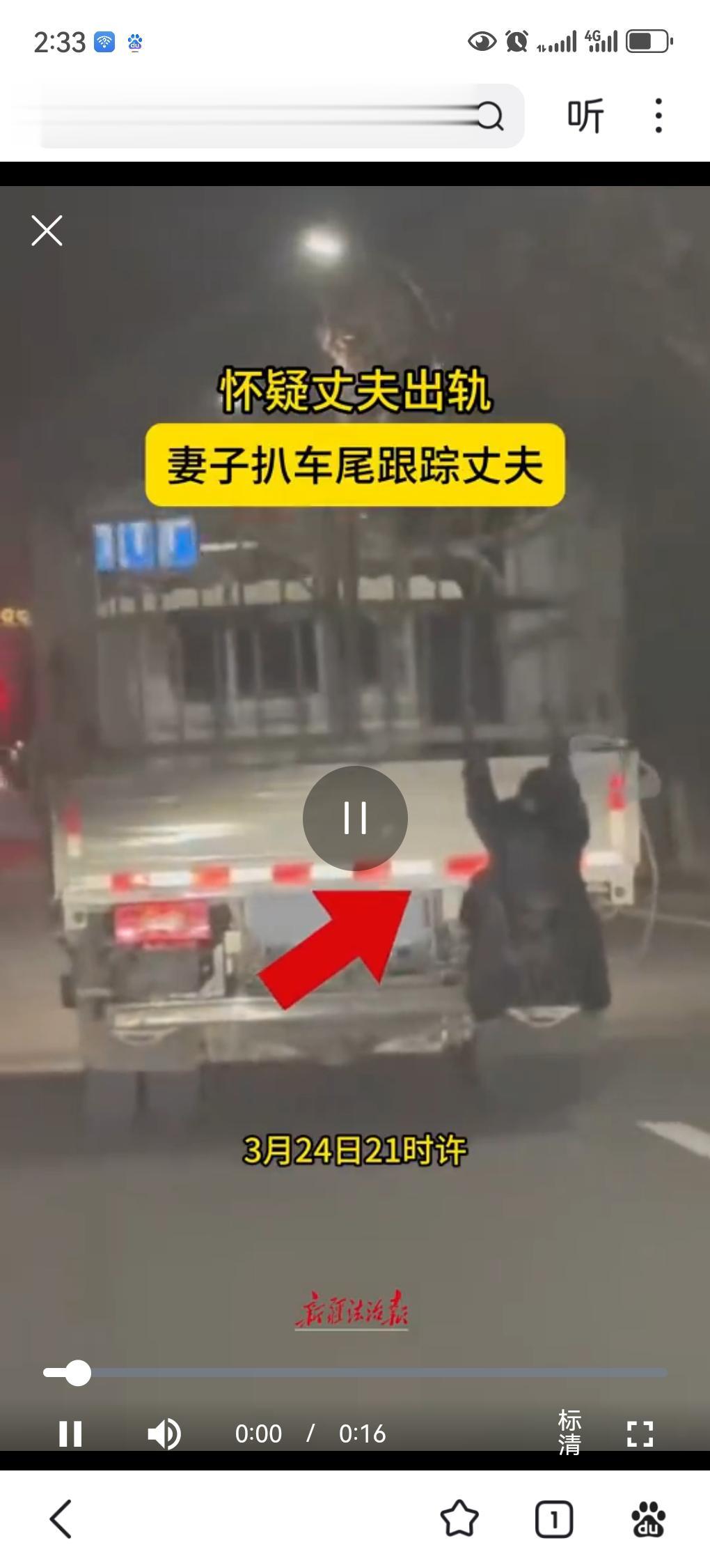 哎吆来,就说这女子对自己也太狠了。 你猜怎么着,深夜丈夫驾驶货车出门,老婆就直接挂在车尾尾随,是挂在车尾。 这怀疑自己的丈夫出轨,这想出了一个点子那就是在丈夫出门后,偷偷的跟随着丈夫外出。 心里想着能够抓个现成,可是这最后出轨的证据没找到,却被交警直接抓个现行。 交警问到司机:“你认识后面挂着的人吗?” 司机表示:“认识,是我的老婆”。 这处理方式呢?扣了三分罚了200,想必两口子回家又是一顿吵。