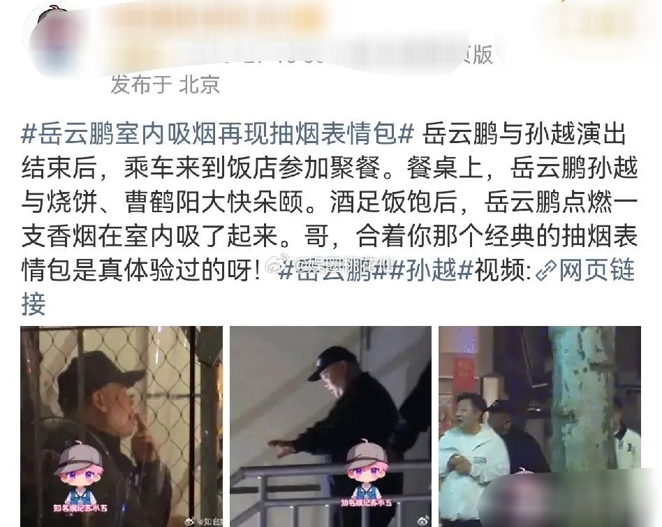 岳云鹏室内抽烟引热议,公众人物更该守规矩德云社演出刚结束,岳云鹏就和孙越、烧饼、曹鹤阳等人聚餐,酒足饭饱后在饭店室内点烟,直接被推上热搜 。台上模仿于谦抽烟的名场面深入人心,大家才发现这表情包不是演的,是真有生活体验 。但饭店是密闭公共场所,国内早就明确室内全面禁烟,北京等地规定,个人在禁烟区吸烟可处50-200元罚款 。聚餐放松没问题,但在室内抽烟,既让旁人被迫吸二手烟,也违反控烟条例。作为公众人物,更该以身作则,别让舞台形象和现实行为反差太大。