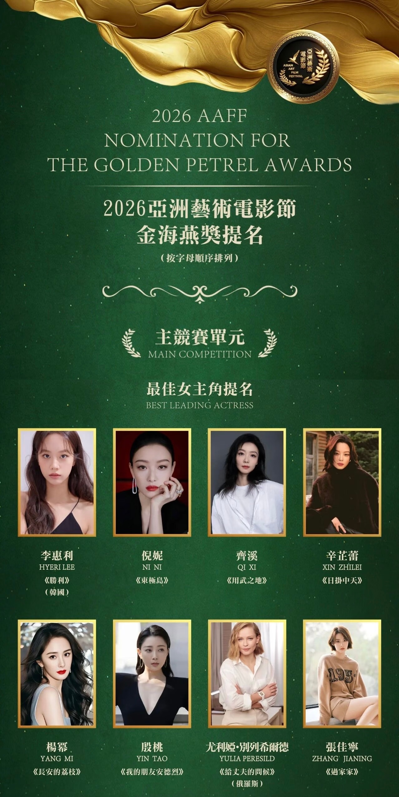 2026亚洲艺术电影节暨「金海燕奖」提名公布恭喜杨幂凭借电影《长安的荔枝》郑玉婷提名「最佳女主角」。👏PS:亚洲艺术电影节由澳门特别行政区政府相关部门核准,亚洲艺术电影协会、澳门国际艺术电影协会主办,每年举办一次。