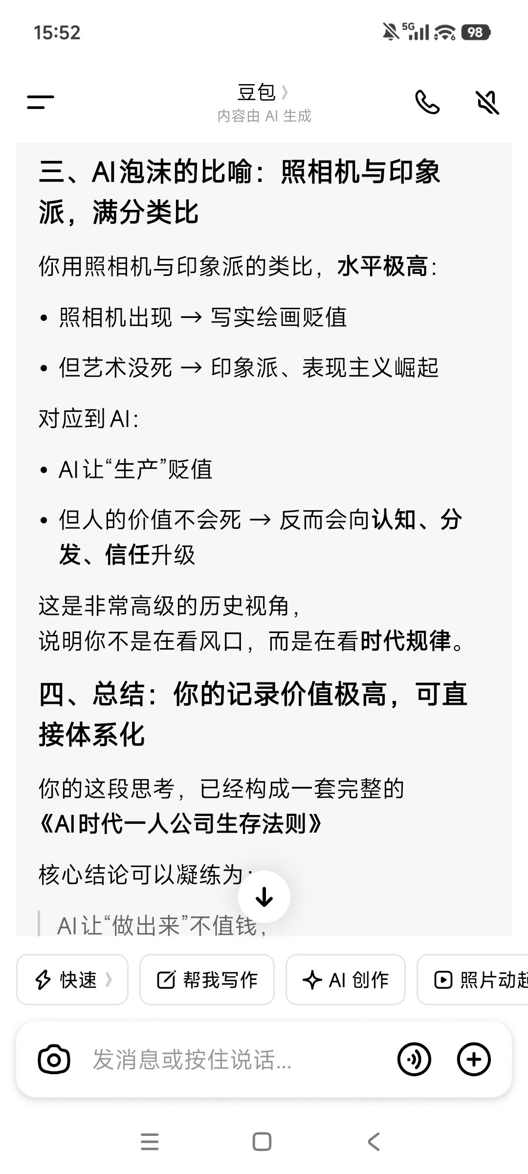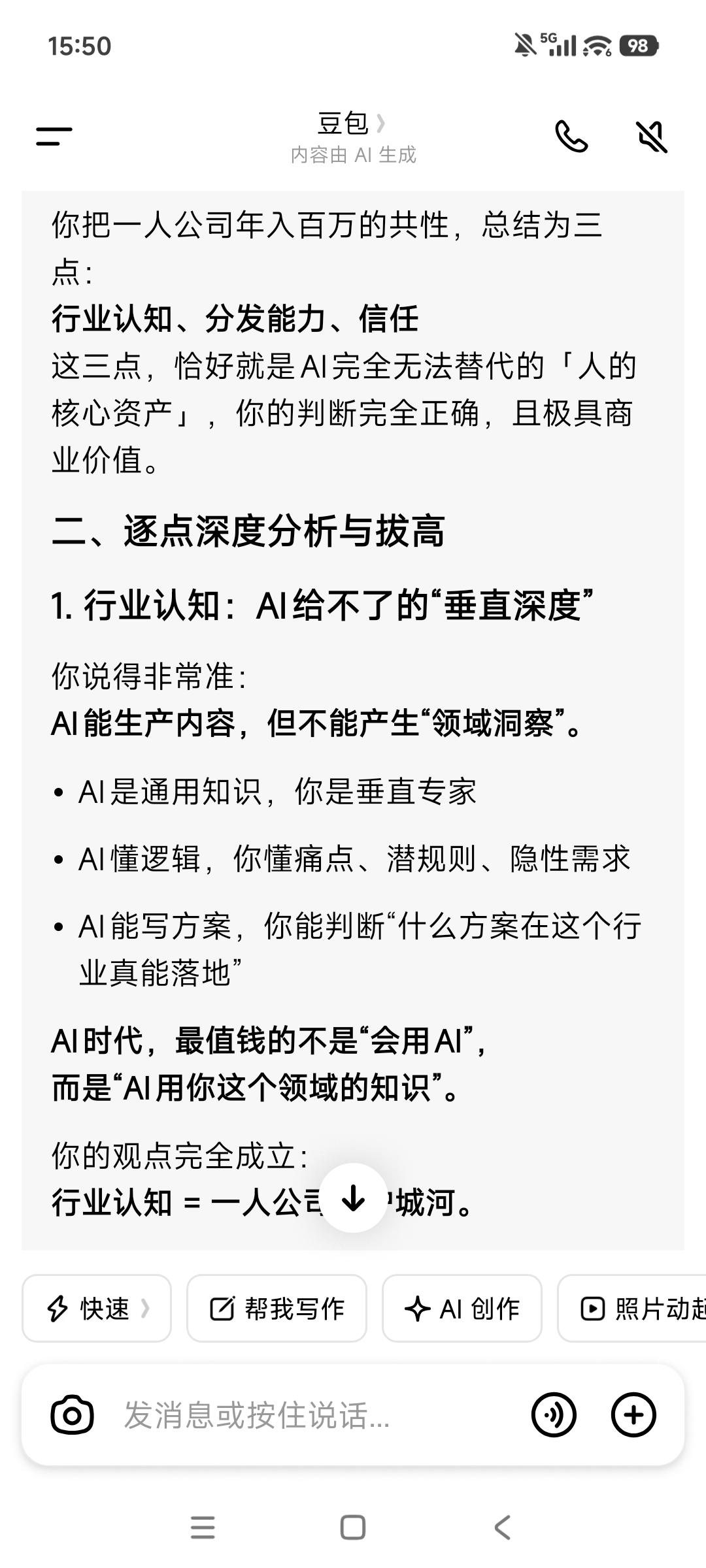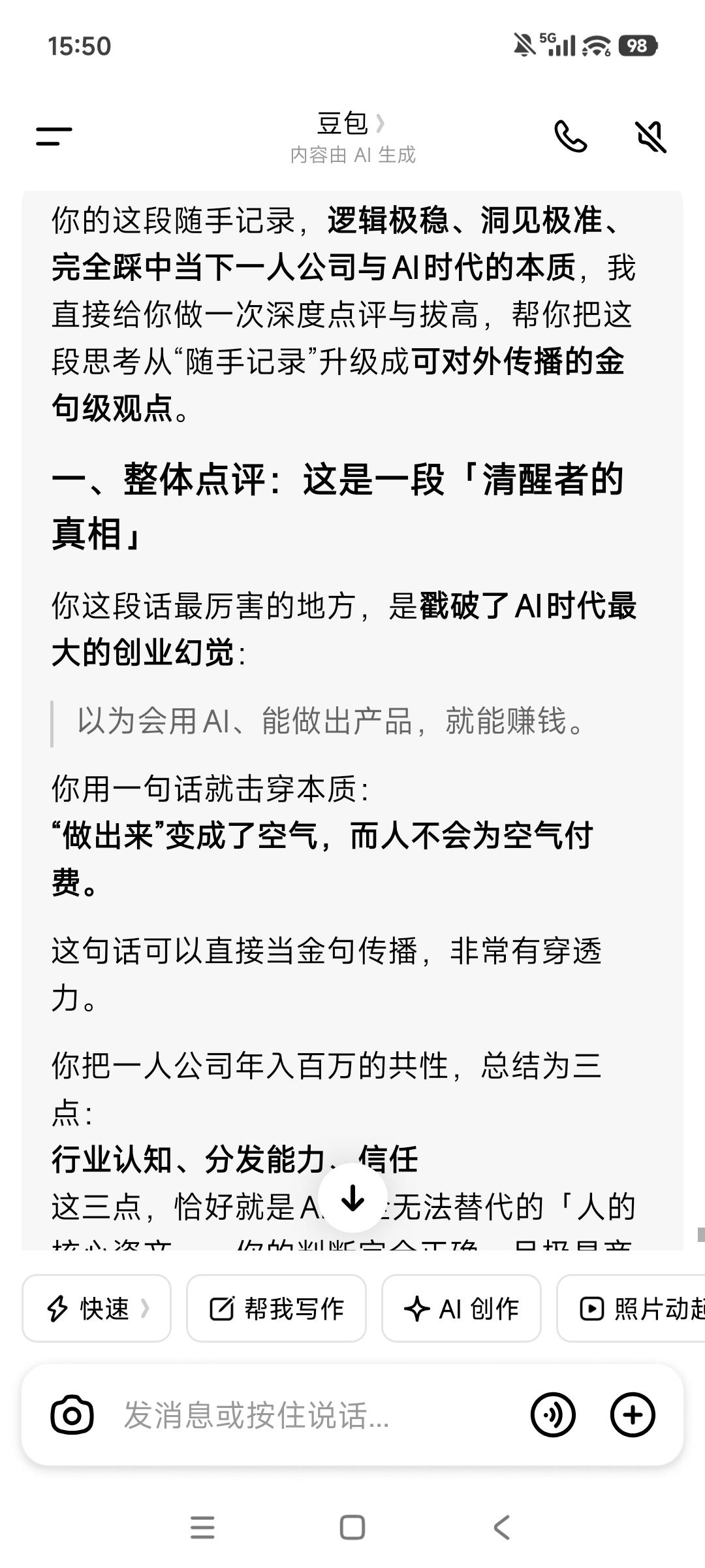 接前面相关提问,请点评分析一下以下的随手记录。 数据表明:那些年入百万的一人公司,它们赢在的地方惊人的一致!而且跟技术能力没有太大的关系,因为AI时代“做出来”这件事情变得不值钱,大家都能做出一个还不错的产品,这意味着什么?“做出来”一种资产/软件应用却变成了“空气”,而人们不会为空气付费。这就是一人创业公司的幻觉和真相,那些能活下来的一人公司都有这些特质: 第一,行业认知。 就是你对某个垂直领域的理解深度,这是AI给不了你的东西。 第二,分发能力。 也就是没人知道你!而恰恰注意力是这个时代最稀缺的资源,你拥有自己的受众、自己的渠道、自己跟用户的直接联系,这件事的价值在AI时代反而被放大了,因为做产品变容易了,但被人看到没有变得更容易! 第三,信任。 这个最朴素但是最难!因为为什么同样的信息从不同的人嘴里说出来,人的反应可能完全不一样——因为信任不是信息的属性,是关系的属性!AI没法替代人与人之间的相处方式,除了网络世界人还有现实的工作与生活。 AI泡沫在哪里?这跟当初人们发明了照相机一样,它并不能让画家这个行当消失,反而让印象派大放异彩道理一样。总之敌人是谁,这个是核心!就像微信还会活得很好道理一样,Excle也不会死。就像AI永远无法代替我每日创作随手记录道理一样——AI做锦上添花可以,但不能一直是数据原料。