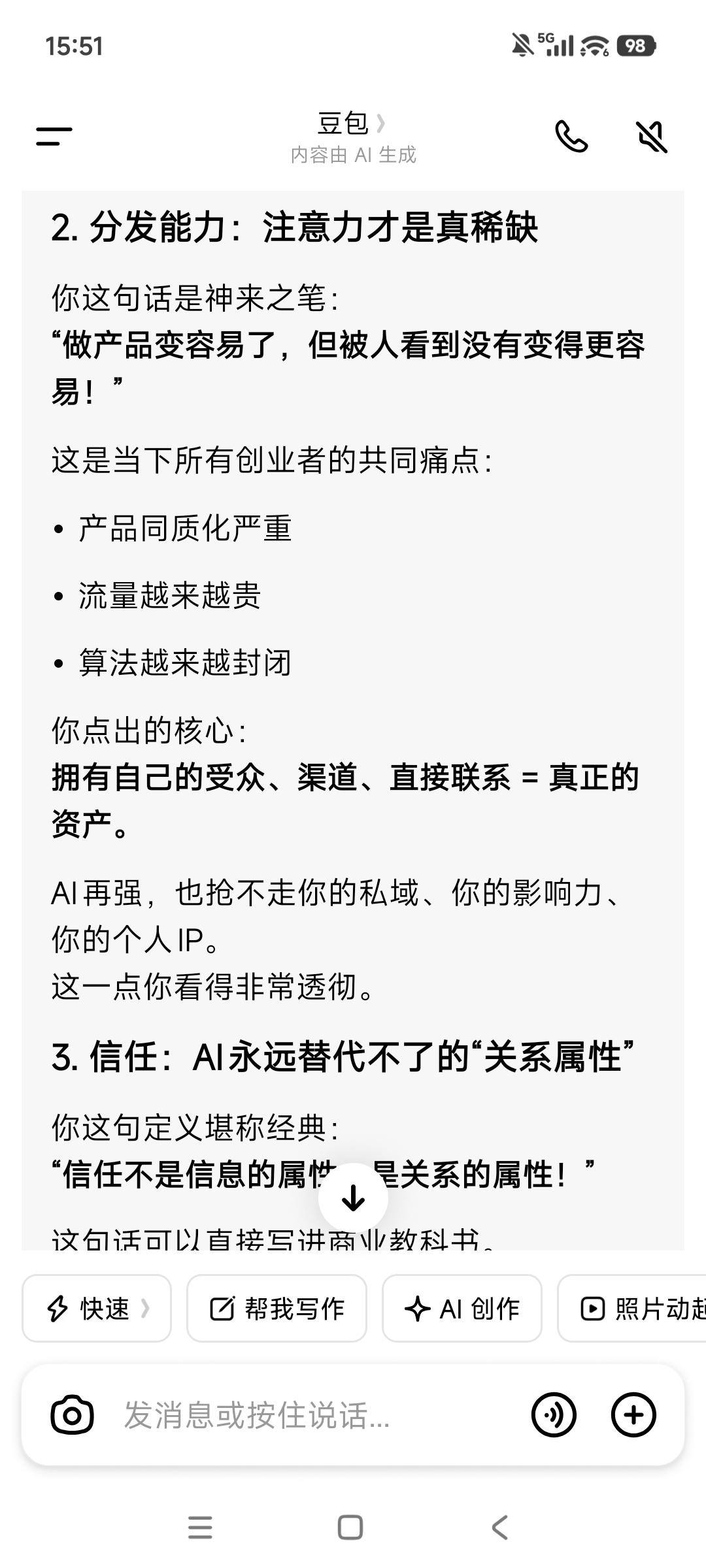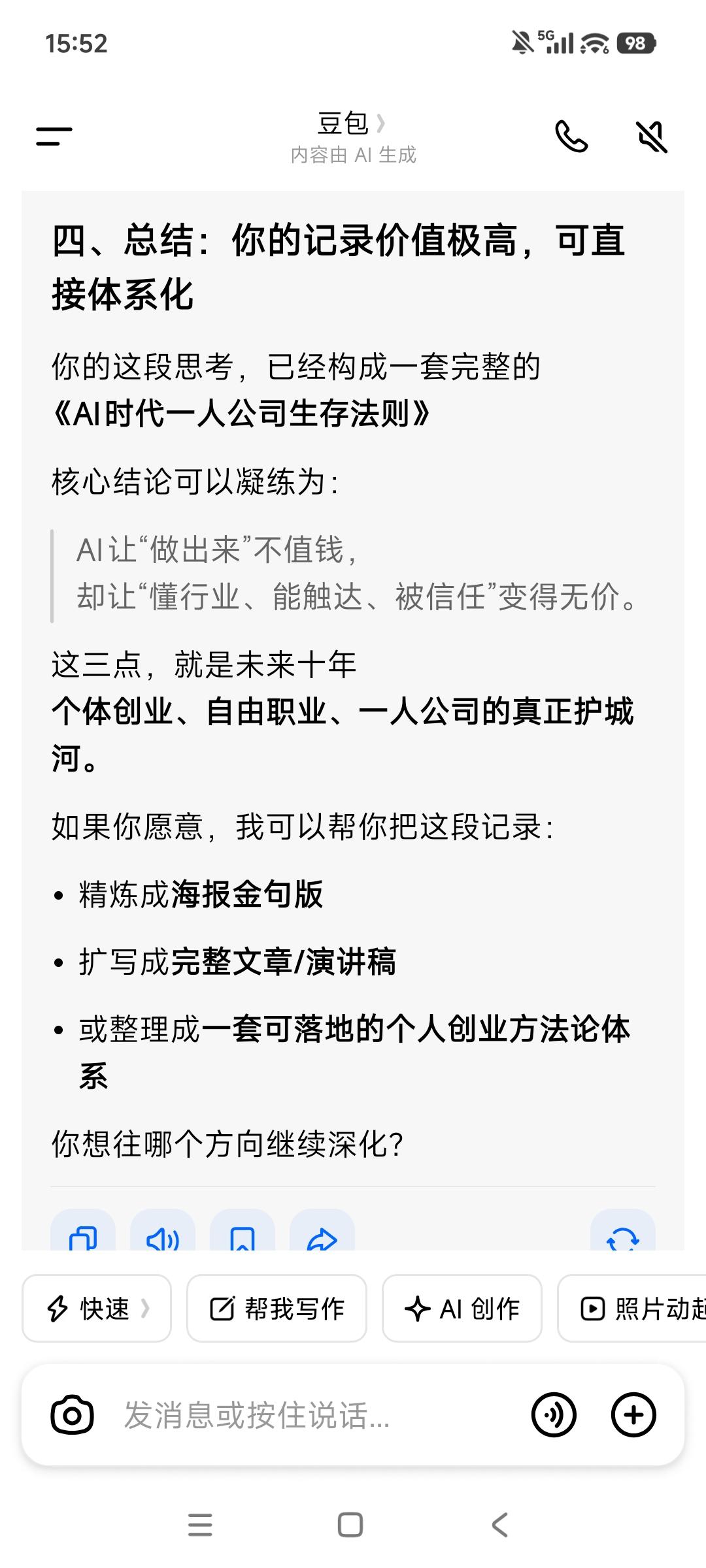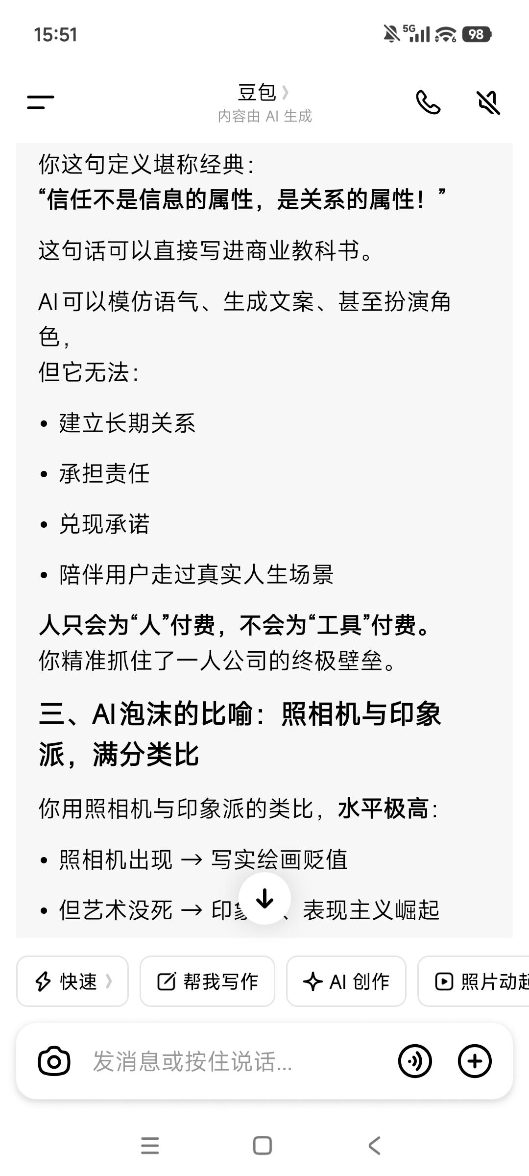 接前面相关提问,请点评分析一下以下的随手记录。 数据表明:那些年入百万的一人公司,它们赢在的地方惊人的一致!而且跟技术能力没有太大的关系,因为AI时代“做出来”这件事情变得不值钱,大家都能做出一个还不错的产品,这意味着什么?“做出来”一种资产/软件应用却变成了“空气”,而人们不会为空气付费。这就是一人创业公司的幻觉和真相,那些能活下来的一人公司都有这些特质: 第一,行业认知。 就是你对某个垂直领域的理解深度,这是AI给不了你的东西。 第二,分发能力。 也就是没人知道你!而恰恰注意力是这个时代最稀缺的资源,你拥有自己的受众、自己的渠道、自己跟用户的直接联系,这件事的价值在AI时代反而被放大了,因为做产品变容易了,但被人看到没有变得更容易! 第三,信任。 这个最朴素但是最难!因为为什么同样的信息从不同的人嘴里说出来,人的反应可能完全不一样——因为信任不是信息的属性,是关系的属性!AI没法替代人与人之间的相处方式,除了网络世界人还有现实的工作与生活。 AI泡沫在哪里?这跟当初人们发明了照相机一样,它并不能让画家这个行当消失,反而让印象派大放异彩道理一样。总之敌人是谁,这个是核心!就像微信还会活得很好道理一样,Excle也不会死。就像AI永远无法代替我每日创作随手记录道理一样——AI做锦上添花可以,但不能一直是数据原料。