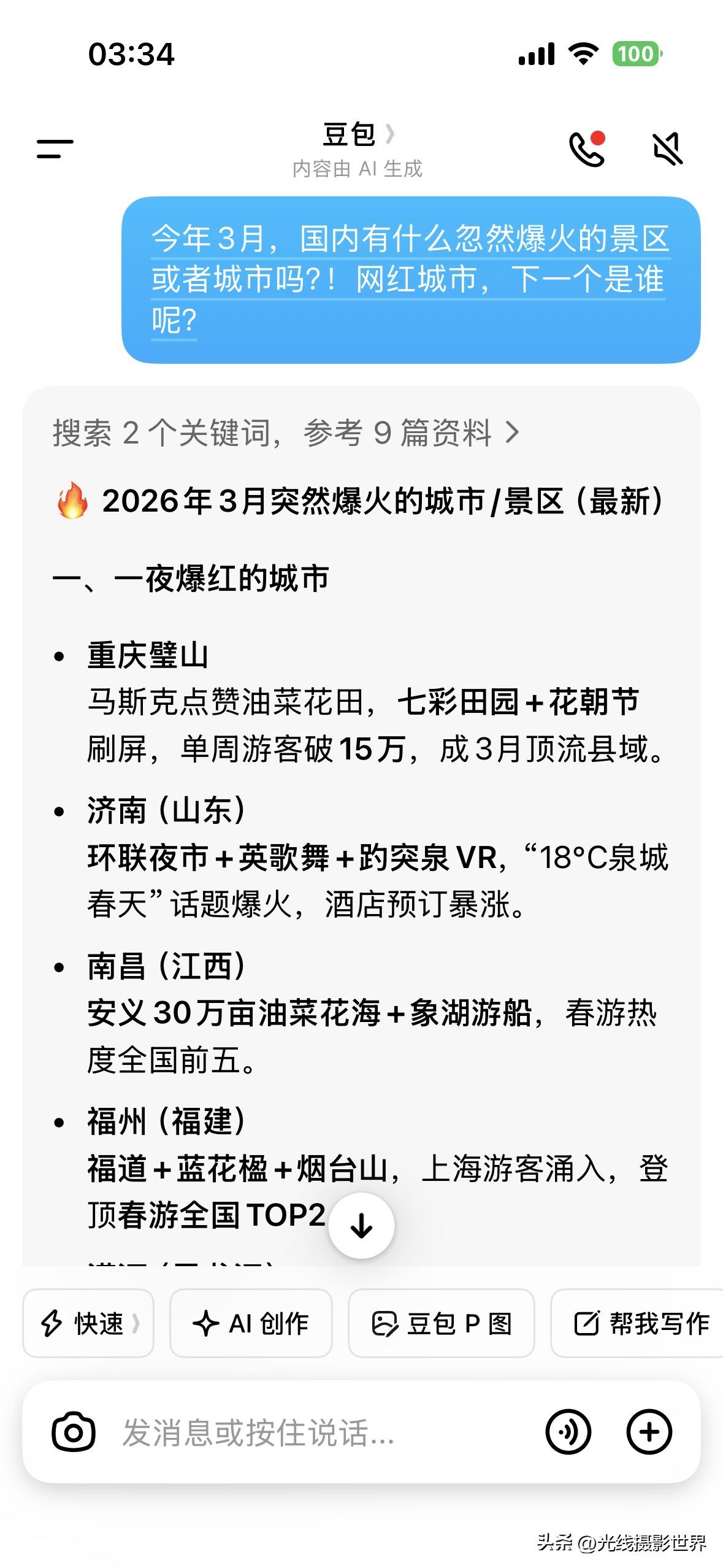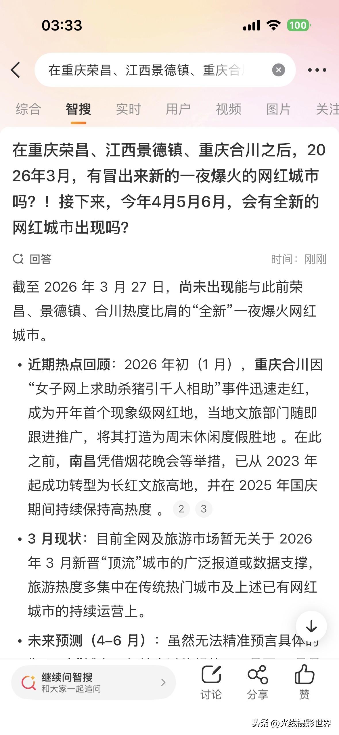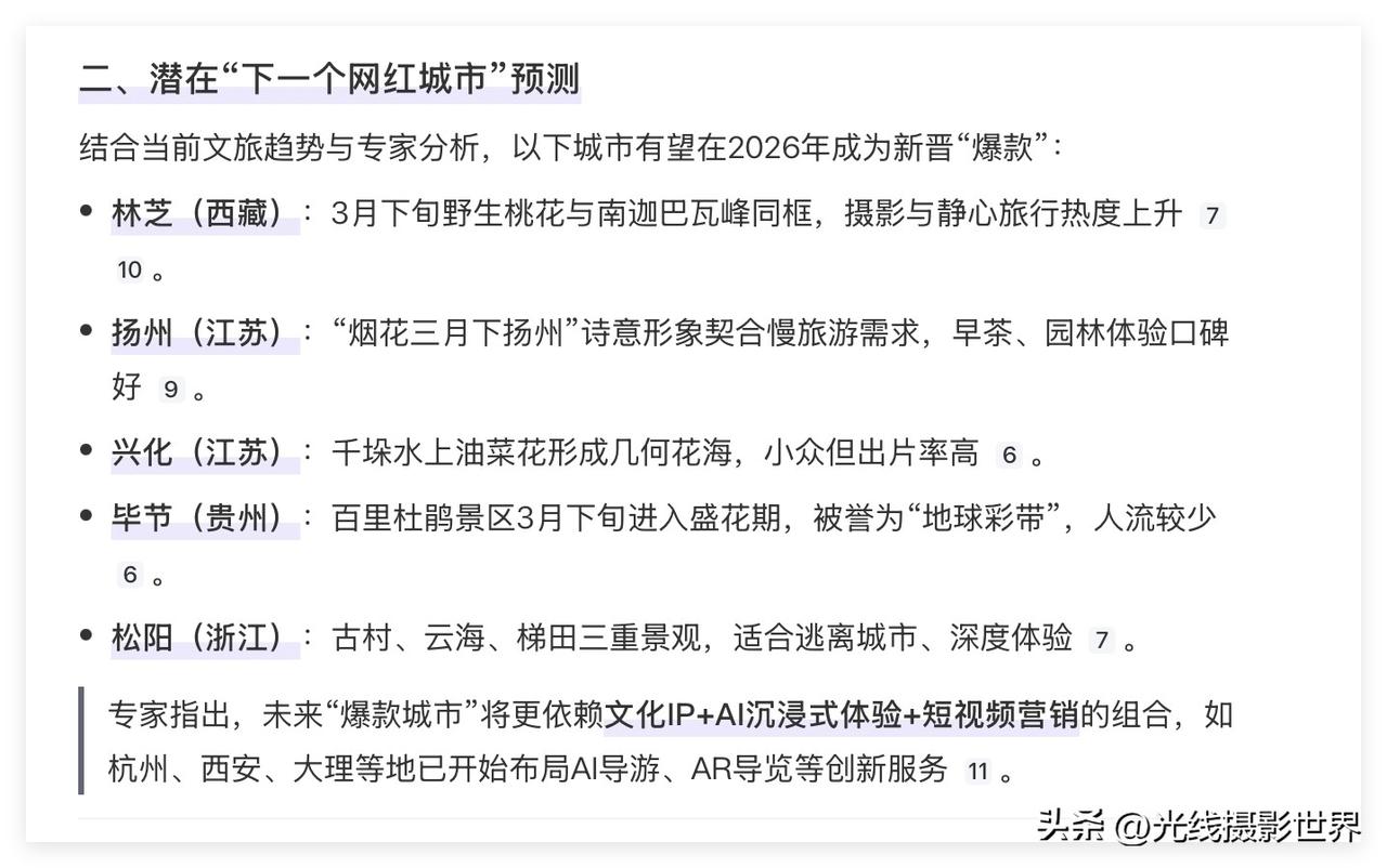 很遗憾,截止2026年3月27日,今年春节以来,中国还没有出现一个全新的一夜爆火的网红城市、网红景点……在重庆荣昌、江西景德镇、重庆合川之后……2026年3月,好像国内没有冒出这种级别的全新的网红城市吧?! 山东淄博烧烤,甘肃天水麻辣烫……这种现象级的一夜爆红的超级爆火的网红…… 接下来,2026年4月到12月,还会忽然冒出来类似这样的超级爆火的大网红城市、大网红景点吗?! 嗯,我是问了好几个AI……今年3月,国内有什么忽然爆火的景区或者城市吗?!网红城市,下一个是谁呢? 在重庆荣昌、江西景德镇、重庆合川之后,2026年3月,有冒出来新的一夜爆火的网红城市吗?!接下来,今年4月5月6月,会有全新的网红城市出现吗? 好吧……2026年,迄今为止,只冒出了一个重庆合川……而且,事实上,重庆合川的文旅和美食,也并没有达到之前重庆荣昌、甘肃天水、山东淄博的这种人气…… 也就是说,2026年迄今为止,国内,还没有真正出现一个超级爆火的网红城市…… 重庆合川的旅游人气和吃喝美食的外地游客数量……真的远不如重庆荣昌爆火的时候…… 大家觉得呢?! 2026年,我感觉吧……今年的3岁小孩子所看到的世界,可能与这个小孩子18年后看到的世界……在建筑、城市面貌……可能没啥区别…… 过去10年,中国建成了太多了新城区,新楼,新公园,新古镇,新古城,新机场,新火车站,新大桥……比如说重庆主城区……但是,未来10年,重庆主城区,还会有啥?! 未来10年,重庆还是幸运的,还有菜园坝火车站的建成,还有重庆新机场的建成,还有黄桷坪长江大桥的建成……但是,购物中心呢?!体育中心场馆呢?!仿古街区呢?!