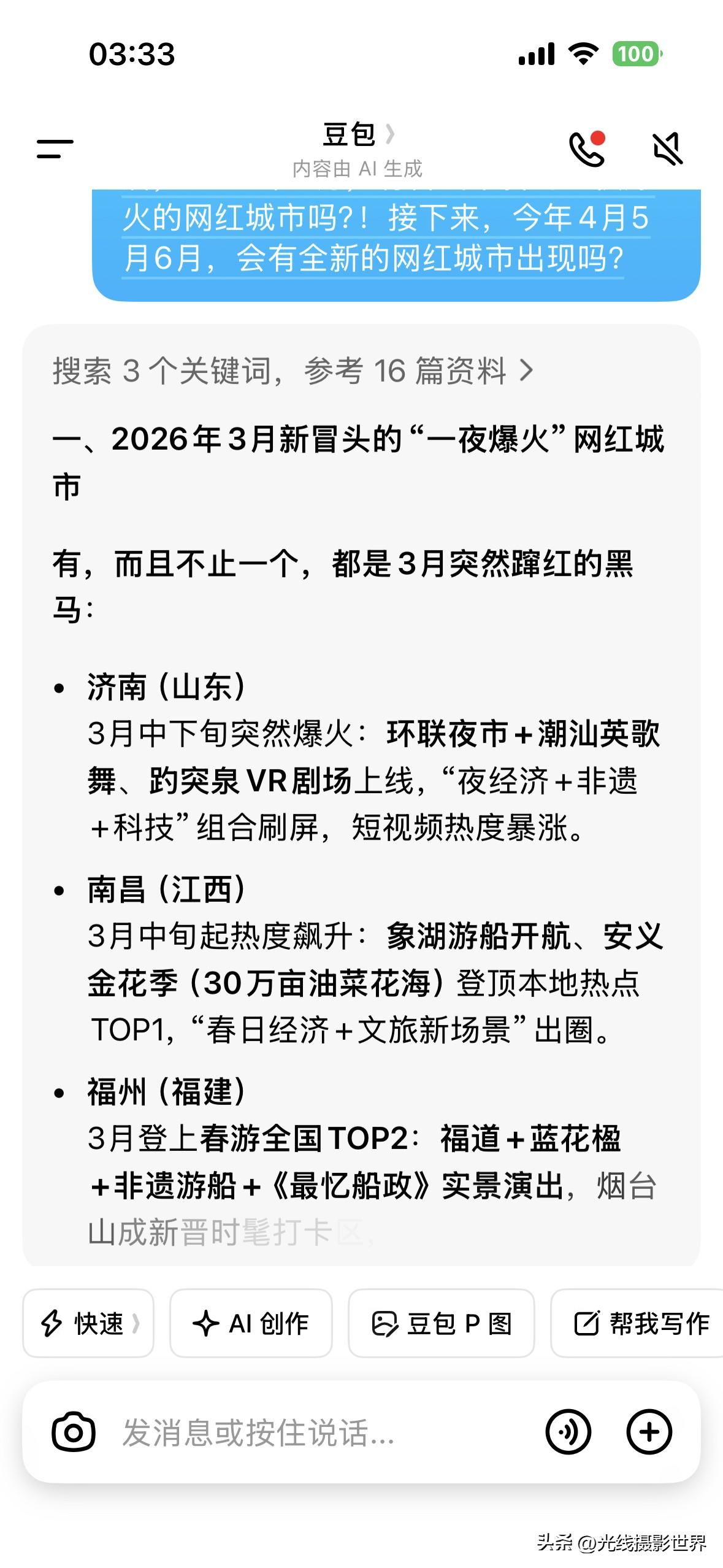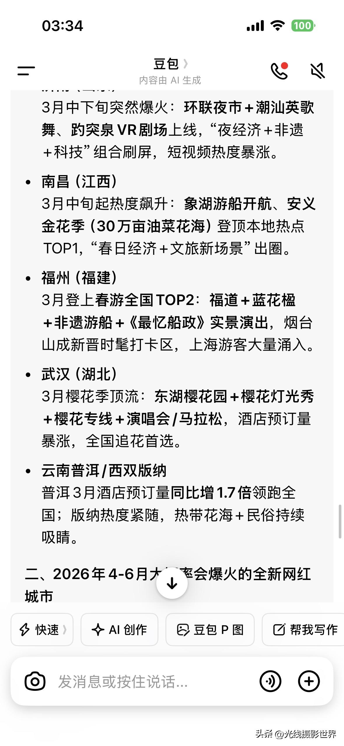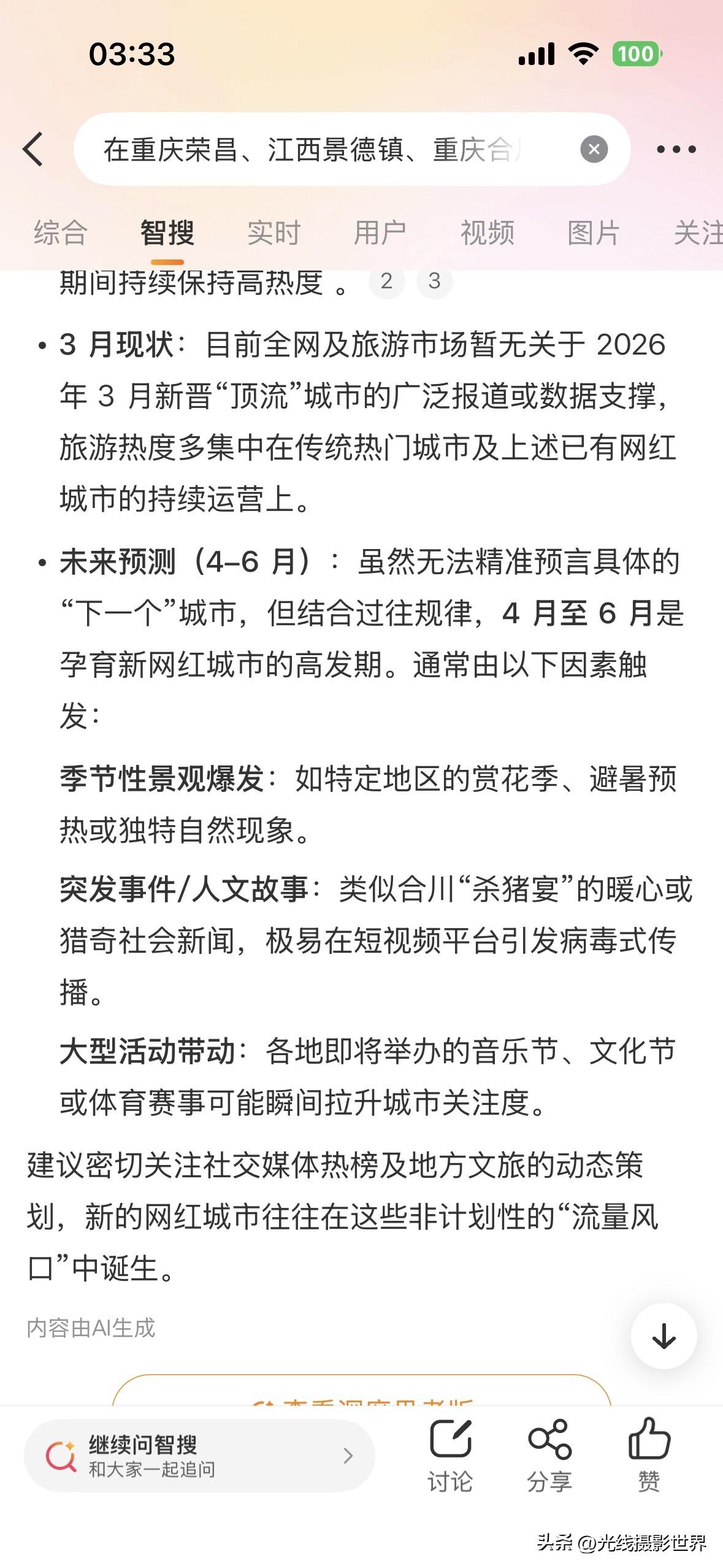 很遗憾,截止2026年3月27日,今年春节以来,中国还没有出现一个全新的一夜爆火的网红城市、网红景点……在重庆荣昌、江西景德镇、重庆合川之后……2026年3月,好像国内没有冒出这种级别的全新的网红城市吧?! 山东淄博烧烤,甘肃天水麻辣烫……这种现象级的一夜爆红的超级爆火的网红…… 接下来,2026年4月到12月,还会忽然冒出来类似这样的超级爆火的大网红城市、大网红景点吗?! 嗯,我是问了好几个AI……今年3月,国内有什么忽然爆火的景区或者城市吗?!网红城市,下一个是谁呢? 在重庆荣昌、江西景德镇、重庆合川之后,2026年3月,有冒出来新的一夜爆火的网红城市吗?!接下来,今年4月5月6月,会有全新的网红城市出现吗? 好吧……2026年,迄今为止,只冒出了一个重庆合川……而且,事实上,重庆合川的文旅和美食,也并没有达到之前重庆荣昌、甘肃天水、山东淄博的这种人气…… 也就是说,2026年迄今为止,国内,还没有真正出现一个超级爆火的网红城市…… 重庆合川的旅游人气和吃喝美食的外地游客数量……真的远不如重庆荣昌爆火的时候…… 大家觉得呢?! 2026年,我感觉吧……今年的3岁小孩子所看到的世界,可能与这个小孩子18年后看到的世界……在建筑、城市面貌……可能没啥区别…… 过去10年,中国建成了太多了新城区,新楼,新公园,新古镇,新古城,新机场,新火车站,新大桥……比如说重庆主城区……但是,未来10年,重庆主城区,还会有啥?! 未来10年,重庆还是幸运的,还有菜园坝火车站的建成,还有重庆新机场的建成,还有黄桷坪长江大桥的建成……但是,购物中心呢?!体育中心场馆呢?!仿古街区呢?!