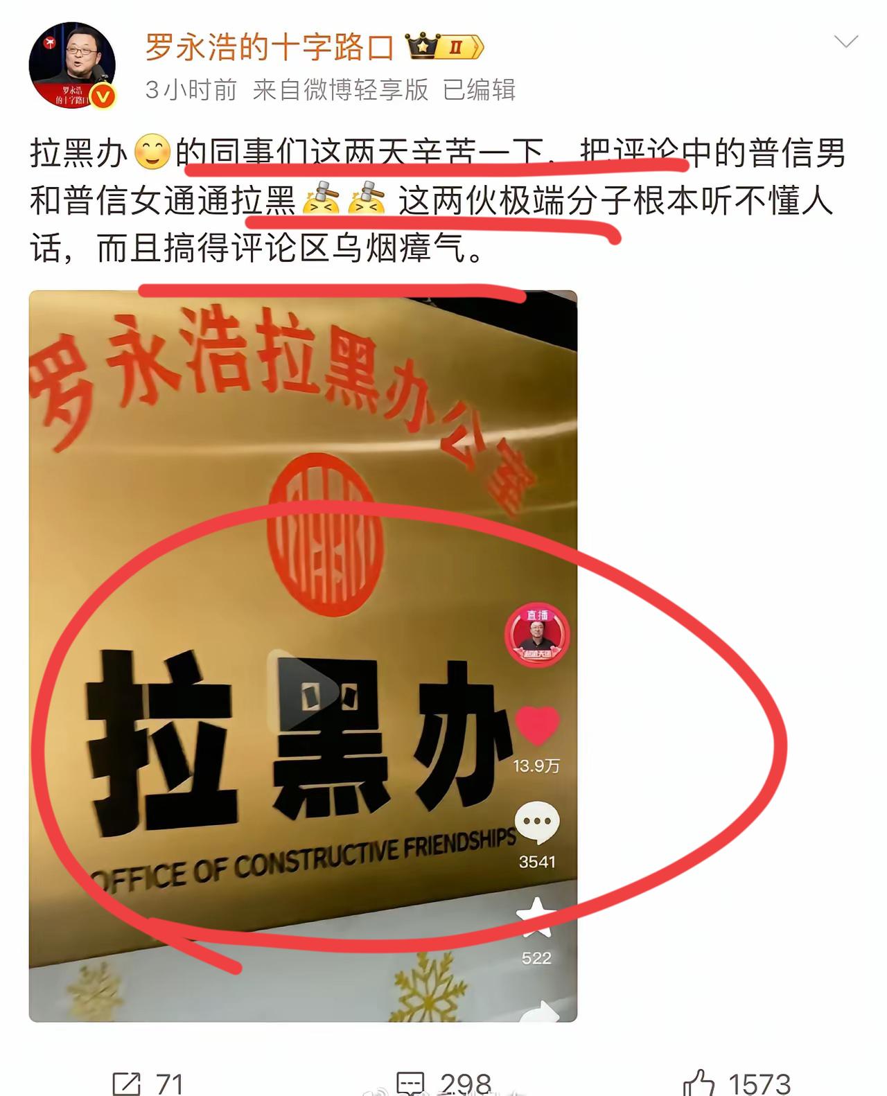老罗啊,老罗,真是有点飘了。 竟公然跟女拳师合作了一期节目; 被网友骂得受不了,就成立了一个拉黑办公室; 这是作死的节奏啊。 老罗可能是太高看自己的实力了。 还说自己是这个超级女拳师的铁粉。 呵呵,从精日走到搞男女对立; 老罗果然没有错过这一切。 之前精·日,网友荀泽了原谅,这次老罗估计难以挺过去了。 也有网友表示,他是想换一个赛道,毕竟看直播,买东西女性居多; 谈他这是想继续直播还债,必须讨好女粉? 这是真的吗,太难为罗老师了吧。 哎,不要晚节不保啊,老罗!!