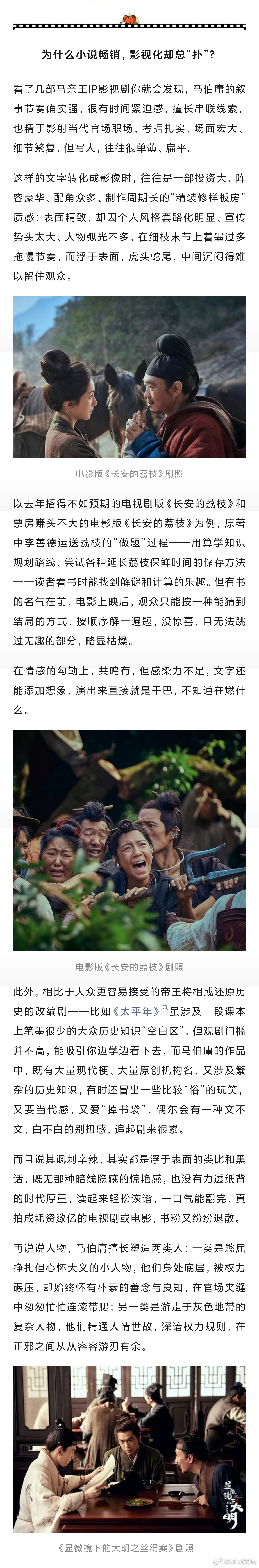 小说虽好,然而马伯庸IP的影视化之路,一直伴随着“叫好不叫座”的争议。除了《长安十二时辰》,《风起洛阳》《显微镜下的大明》《长安的荔枝》等剧,虽制作精良,却大多高开低走,被观众吐槽“精致样板房”、“剧情工具人”。