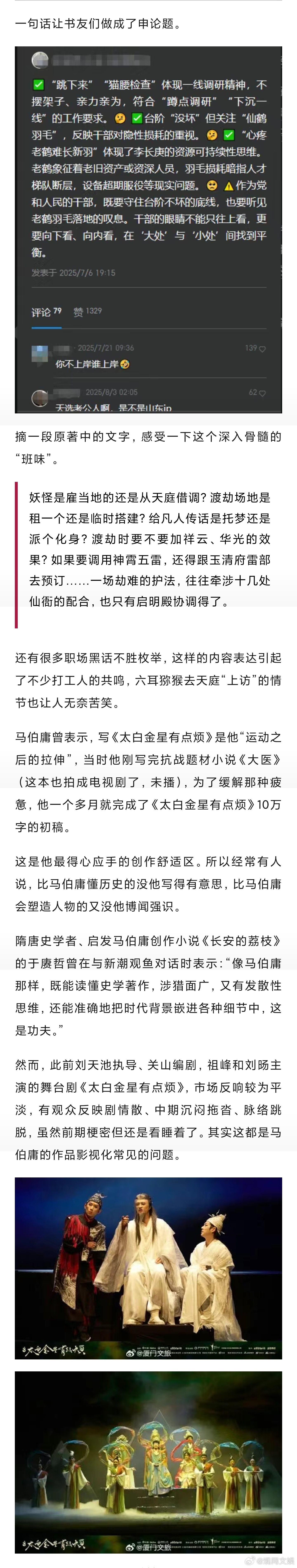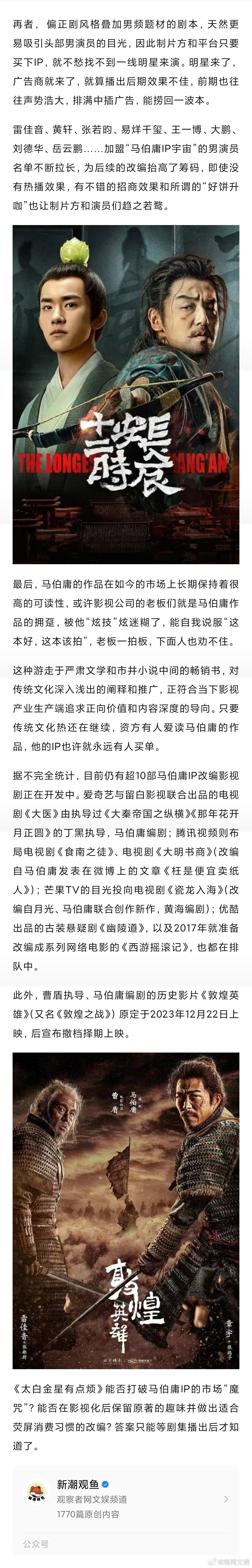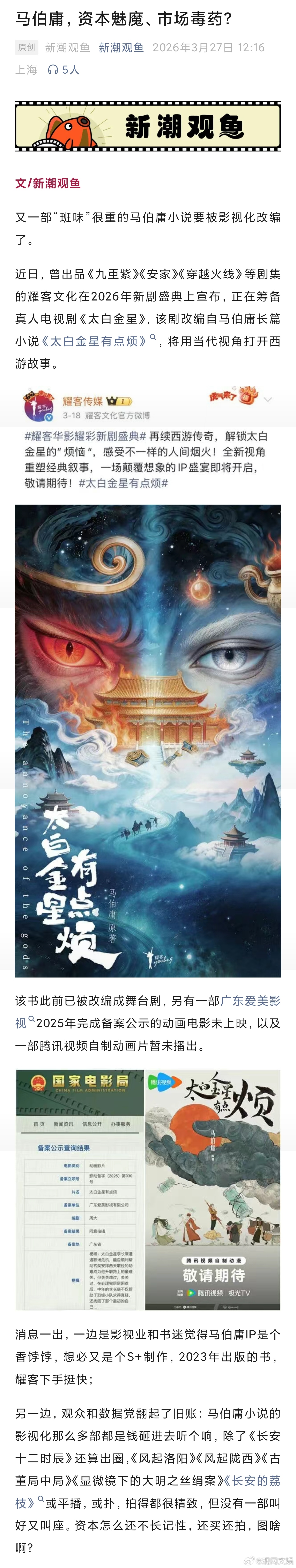 【马伯庸,资本魅魔、市场毒药?】太白金星能逃过马伯庸IP市场魔咒吗马伯庸的IP又要被搬上荧幕了。耀客文化近日宣布筹备真人剧《太白金星》,改编自《太白金星有点烦》。此前,该书已被改编为舞台剧。