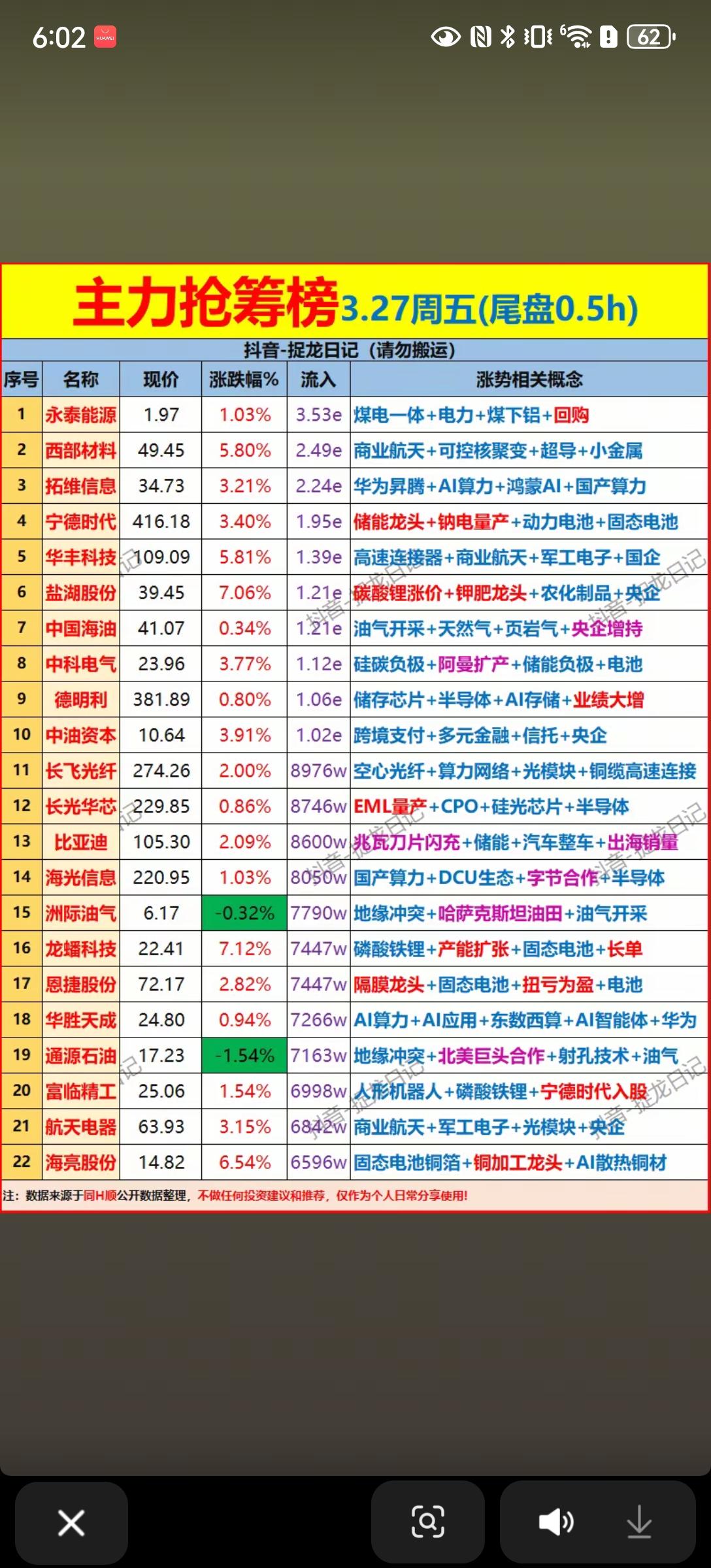 3.27周五尾盘主力抢筹榜解析📊 从尾盘半小时主力资金流向看,能源电力、AI算力、商业航天、新能源电池四大主线最为活跃。 永泰能源以3.53亿流入居首,煤电一体+回购预期获资金集中布局;西部材料、拓维信息分别以2.49亿、2.24亿紧随其后,覆盖商业航天、可控核聚变、国产算力等热门题材,体现资金对高景气科技赛道的偏好。 宁德时代、盐湖股份等新能源龙头获超1亿流入,固态电池、钠电量产等催化持续发酵;AI算力方向,长飞光纤、海光信息等光模块、算力网络标的也获明显资金加仓。 整体来看,尾盘资金仍聚焦高景气赛道与政策利好方向,能源与科技板块形成共振,短期题材轮动效应显著。