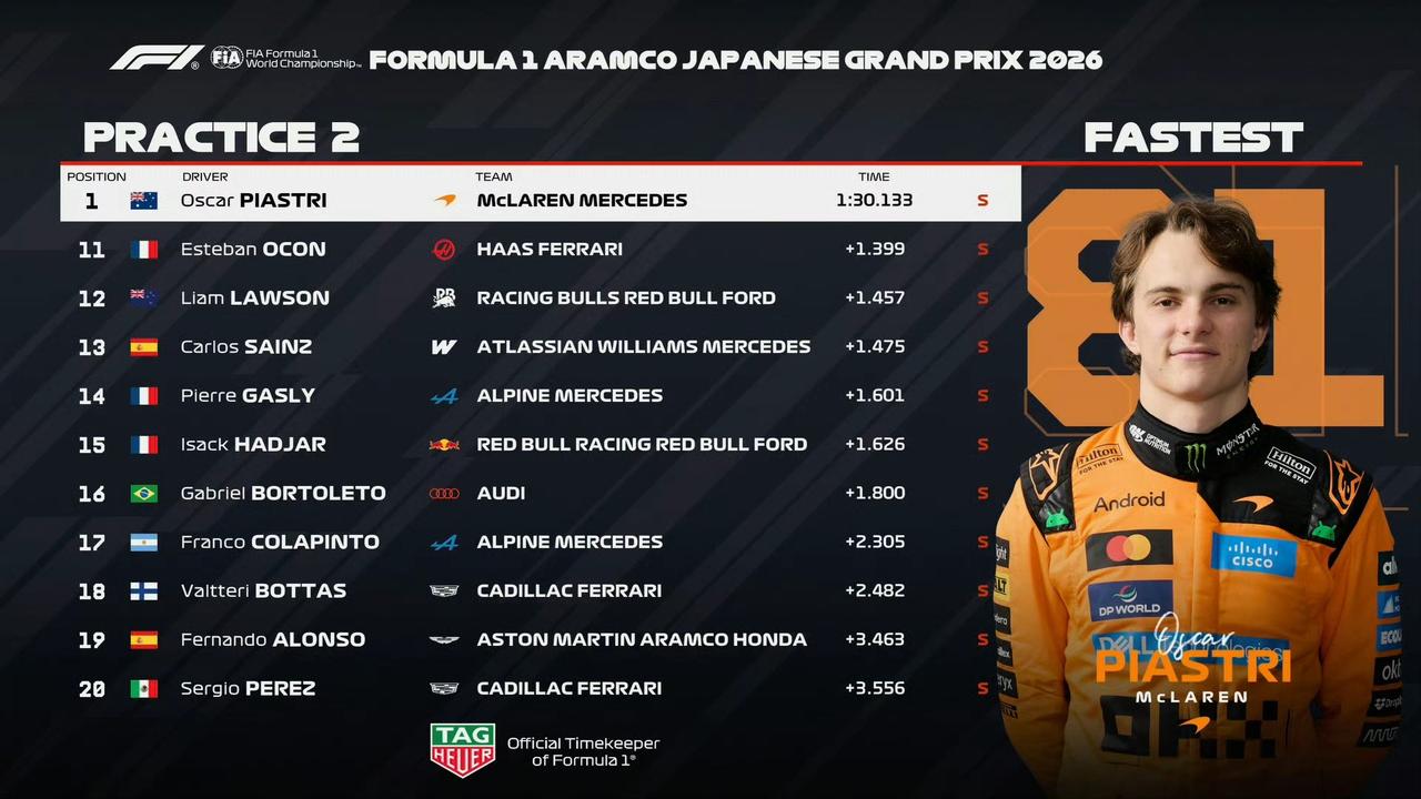 电控问题解决,迈凯伦果然如期恢复!2026F1日本大奖赛二练成绩出炉。 迈凯伦1、4 梅奔2、3 法拉利5、6 红牛太惨了,维斯塔潘10、哈贾尔15。