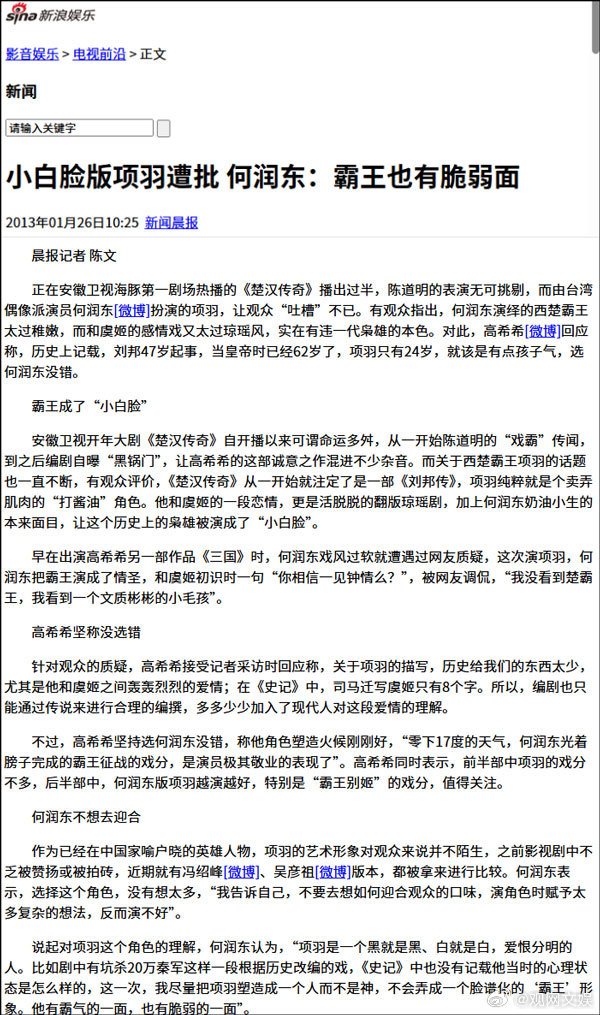 【新潮观鱼:舆论场应容得下粉底液将军】估计何润东也没想到,2012年底《楚汉传奇》首播时,他曾被质疑是“小白脸”项羽,导演高希希多次为其辩护也没能改变舆论;何润东版项羽也曾经历小白脸争议
