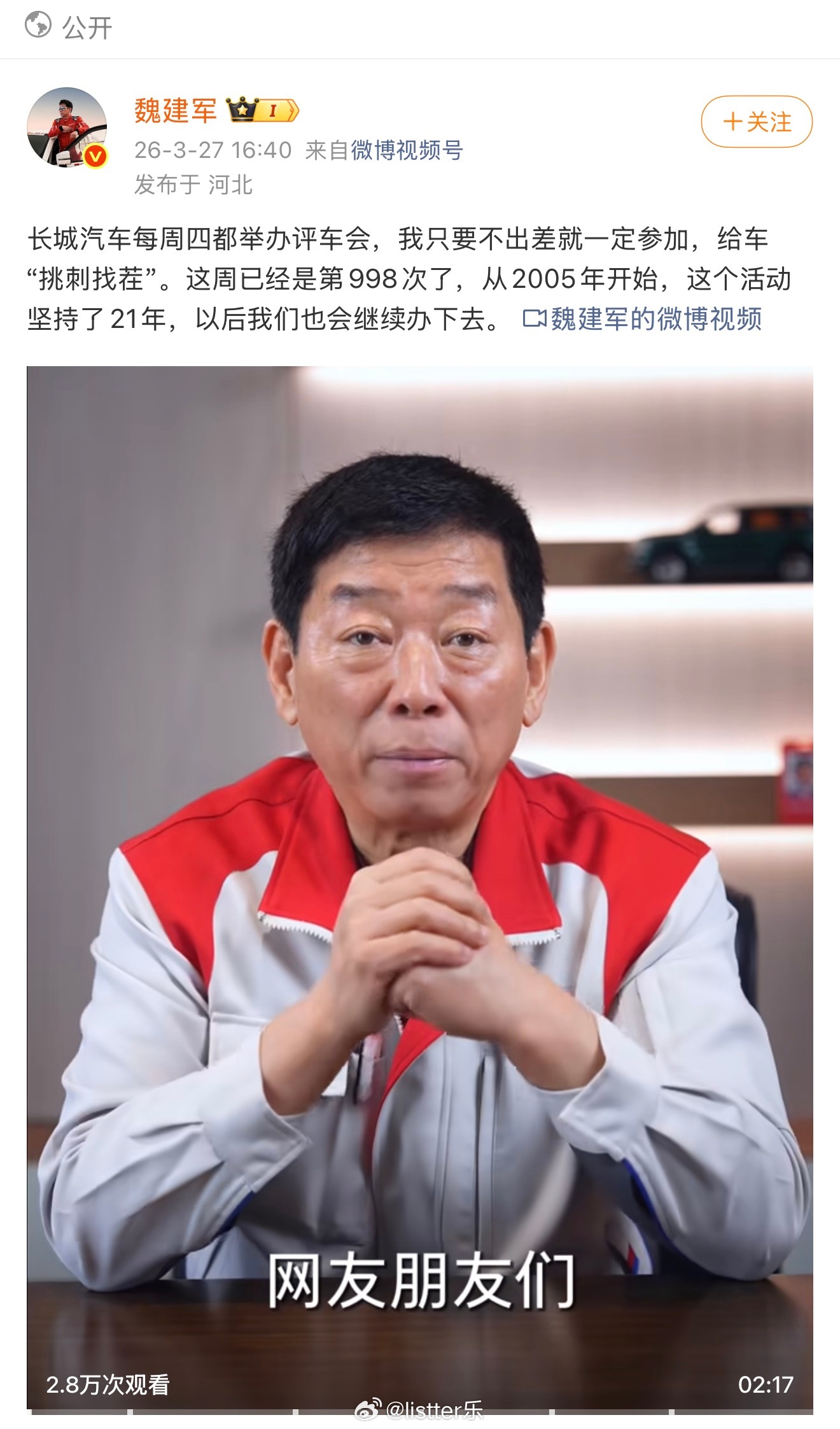 坚守21年!长期主义从不是遥不可及的宏大词汇,而是藏在日复一日的坚持里!长城汽车魏建军带着团队,把每周四早7点半的评车会,坚持了21年近1000次。这不是一个人的坚守,而是一群人十几年、二十余年的同心同行。 魏建军问:你坚持了20年的每周习惯是什么?或许是晨跑,是读书,是为家人做一顿早餐。平凡日常里的点滴坚持,终会酿成时光的答案。长城把对品质的较真刻进每周的坚守,你又在哪个日常里,守住了自己的初心?评论区聊聊你的每周坚持。