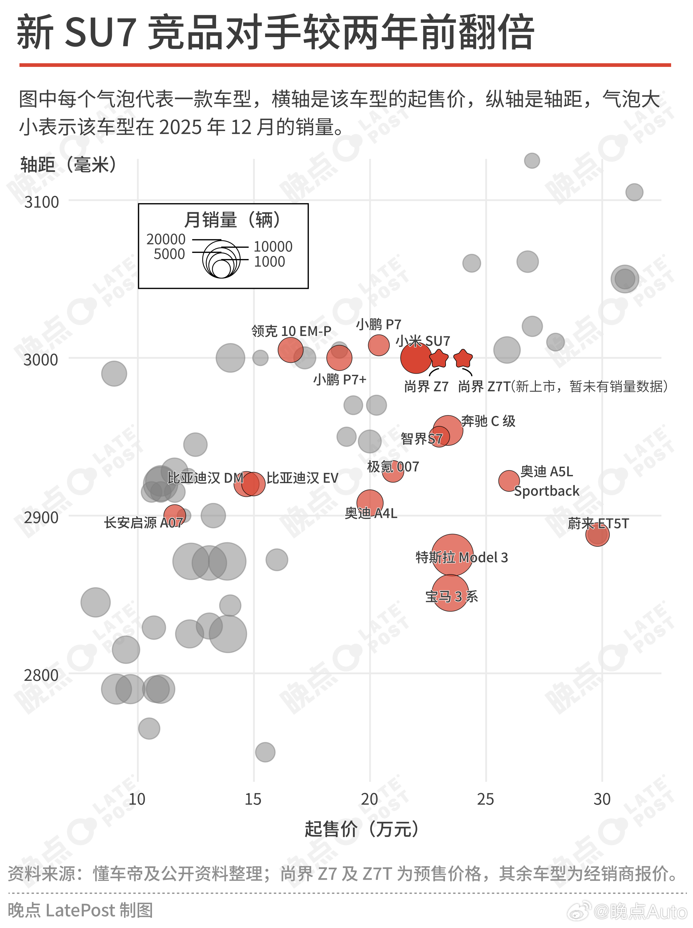 小米新SU7竞品数量较两年前翻倍【改款 SU7 上市一周,周围挤满了各路 “7”】上周改款 SU7 上市那天,小米汽车员工在科技园报告厅集中观看发布会,一位员工说 “今年之后的打算全看今天了,很关键。” 这周小米公布改款 SU7 锁单 3.5 万辆。