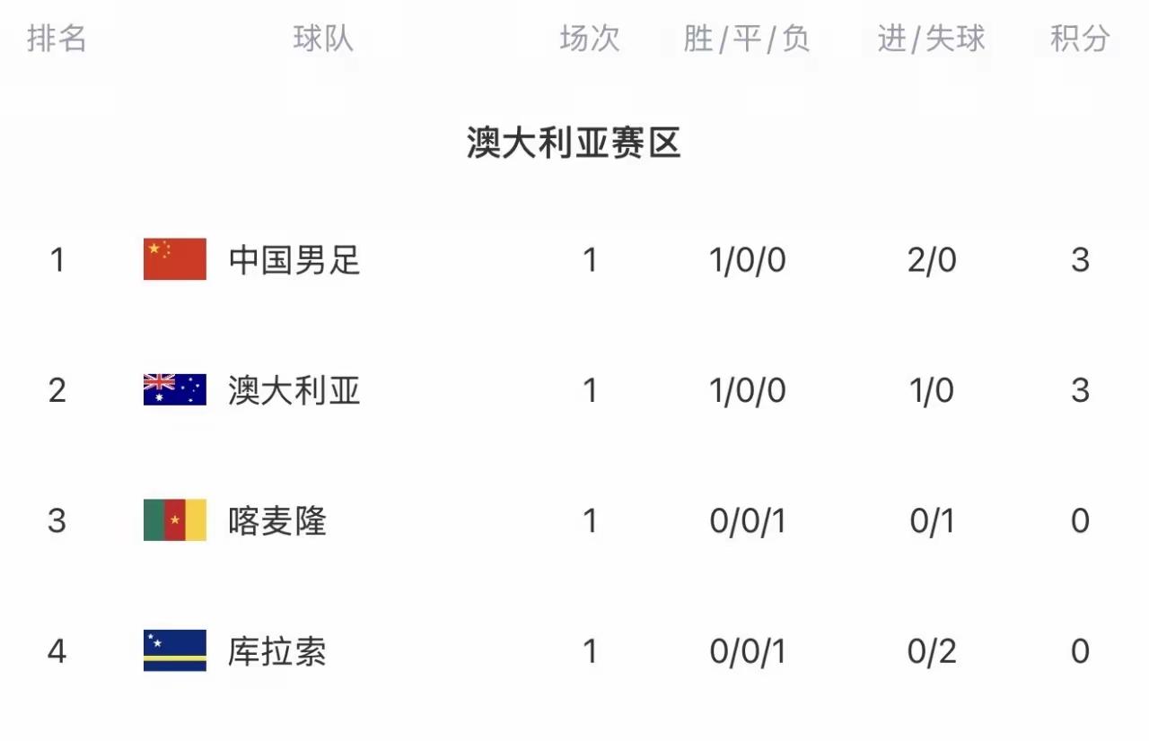 中国队以净胜球力压澳大利亚排在小组第一名,澳大利亚刚刚1比0战胜喀麦隆排名第二,喀麦隆第三名,首次进入世界杯的库拉索垫底。 邵佳一的首秀开门红,中国2比0拿下库拉索真的干净利落,这场比赛中国队打得真的太好了,邵佳一的执教真的让人眼前一亮,国足这个整体攻防转换真的太好了,高位逼抢让库拉索失误太多,国足打球也不拖泥带水了,今天的比赛真的看得太开心了!恭喜邵佳一为中国队开了一个好头,希望31号对喀麦隆能让人再一次惊喜!中国队加油!