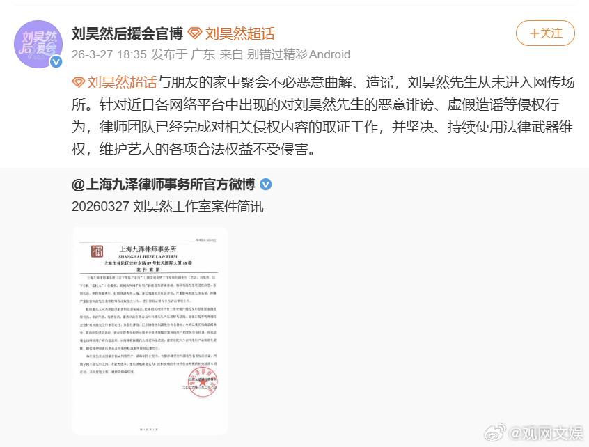 【刘昊然方律师声明】后援会称刘昊然从未进入网传场所3月27日,发布刘昊然工作室案件简讯,近期相关网络平台上部分用户通过发布恶意捏造的虚假信息、诽谤信息、侮辱信息,蓄意以此引导公众对刘源先生产生误解与质疑,旨在引发不明真相的公众针对刘源先生作出否定性、负面性评价,已涉嫌侵害刘源先生的名誉权,本所已受托完成证据保全,将向法院提起诉讼。