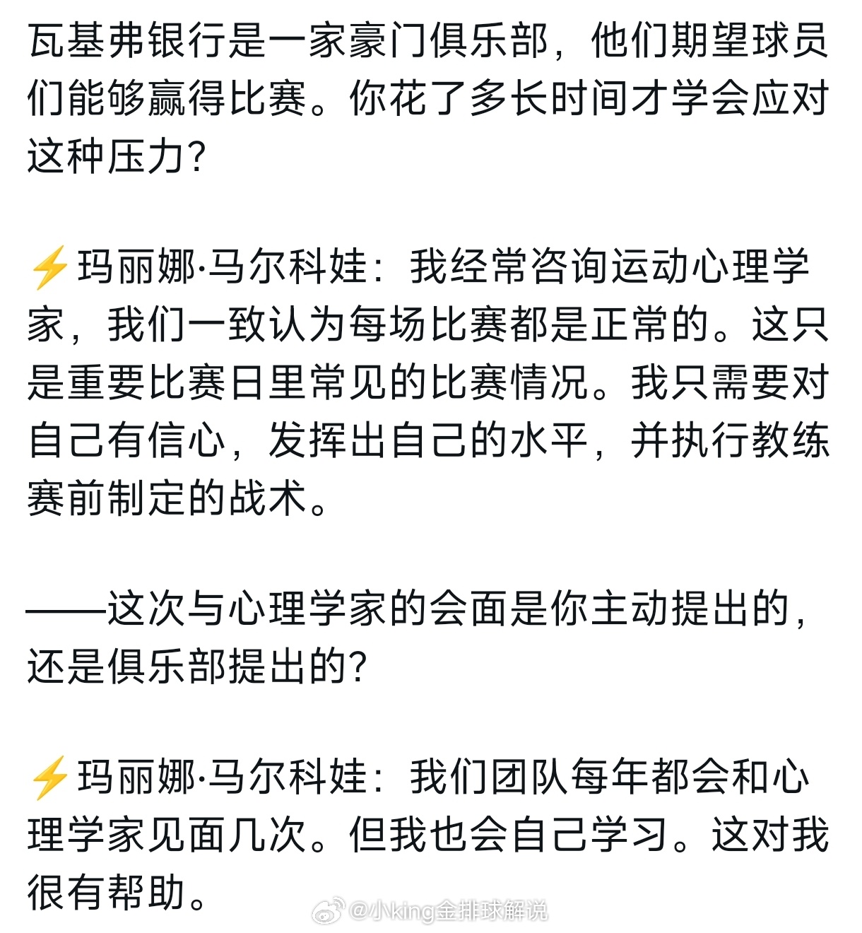 马尔科娃部分采访记录。世界排坛资讯