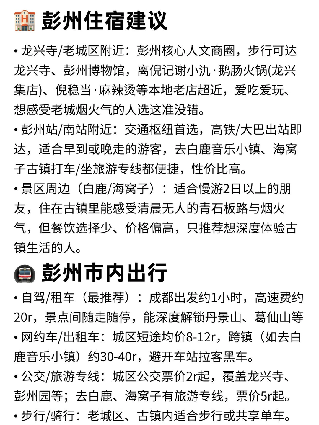 ✍️两天1夜不费腿路线安排: Day1: 龙兴寺 → 彭州园 → 老城区逛吃 Day2: 白鹿音乐小镇 → 海窝子古镇 🏠住宿建议: ✅ 龙兴寺/老城区附近:市中心,步行可达核心景点,离本地老店超近,烟火气足,逛吃方便。 ✅ 彭州站附近:交通枢纽首选,高铁/大巴出站即达,去乡镇景点打车/坐专线便捷,性价比高。 ✅ 地铁站沿线:预算友好,公交/网约车直达核心景点,适合佛系出行。 ⬇️美食推荐: ✅ 倪记谢小氿·鹅肠火锅(龙兴集店) ✅ 倪稳当·麻辣烫 ✅ 肖锅魁(上升街29号院店)
