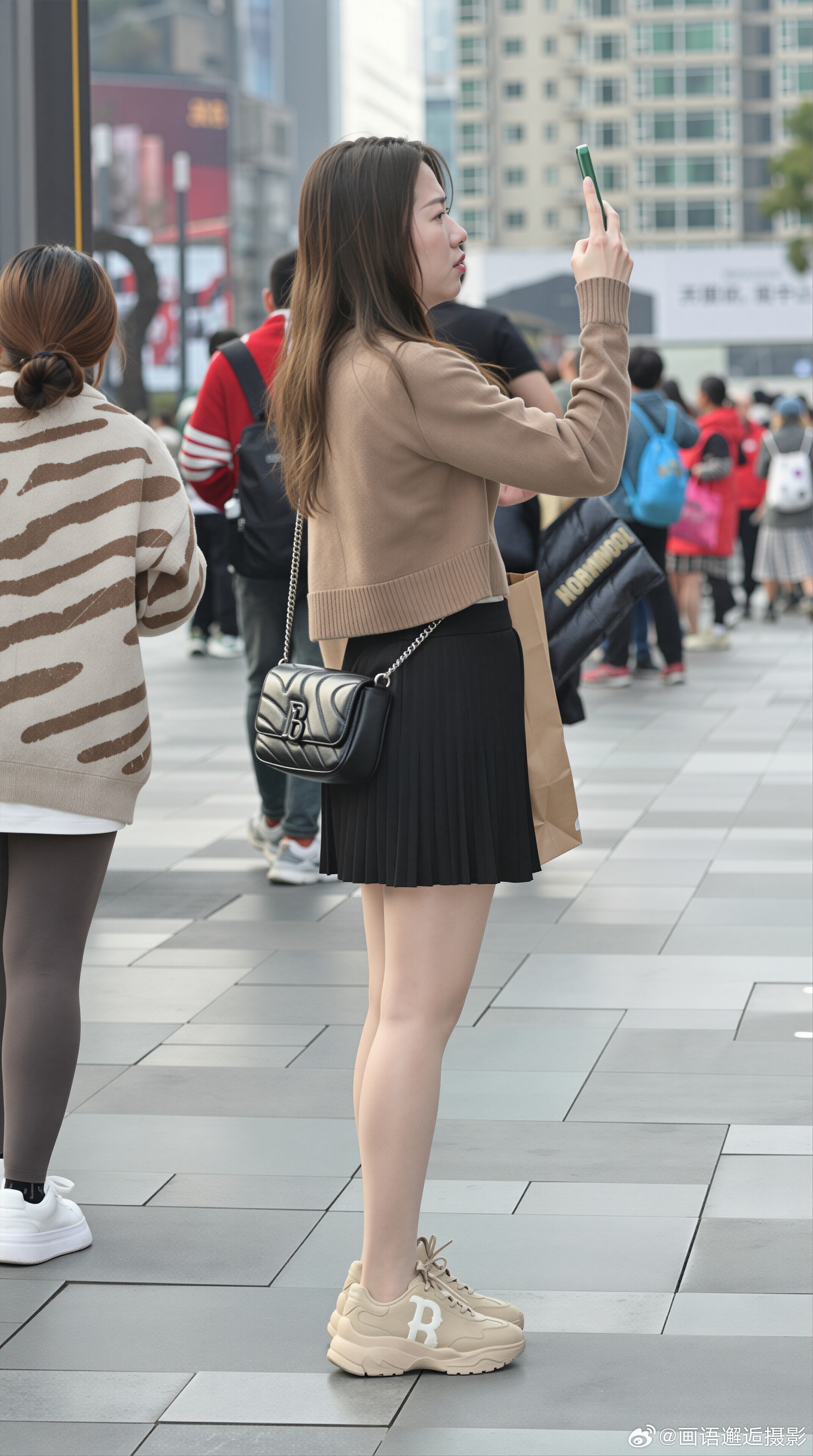 发现你的魅力 驼色针织衫搭配黑色百褶短裙,温柔又不失活力,脚踩米色运动鞋,舒适与时尚兼具,肩背黑色链条包,整体造型简约大方,适合日常通勤或休闲逛街。