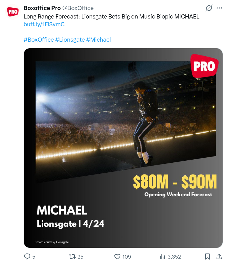 尽管音乐/歌舞片特别是传记类一向更依赖长线发酵,但《迈克尔·杰克逊》无论是关注度还是体量,目前来看都已经远超同类,更像是一部超级大片般的存在,可能在上映初期就剑指各种纪录。