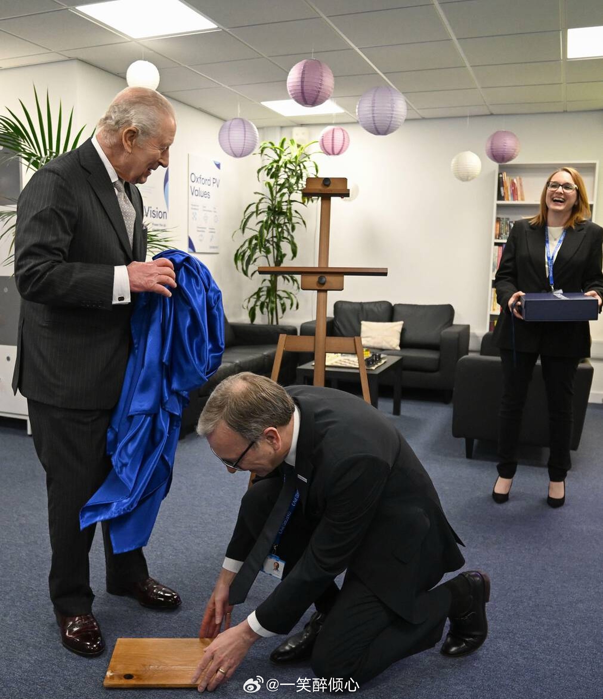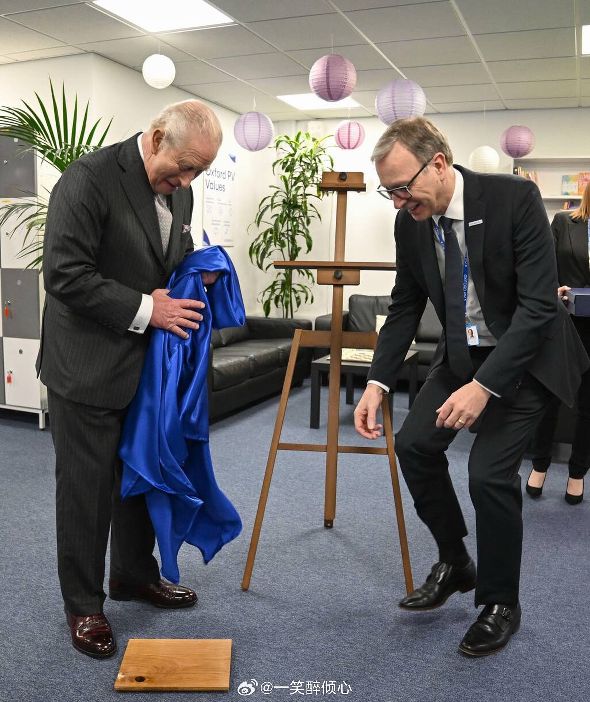 今天查尔斯三世在牛津郡访问新能源企业期间揭牌匾,结果不小心把牌匾从画架上给拽下来了。