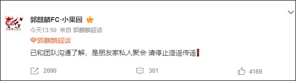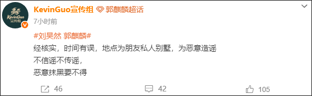 郭麒麟对接回应表示:“已和团队沟通了解,是朋友家私人聚会,请停止造谣传谣”,宣传组补充称:“地点为朋友私人别墅”。