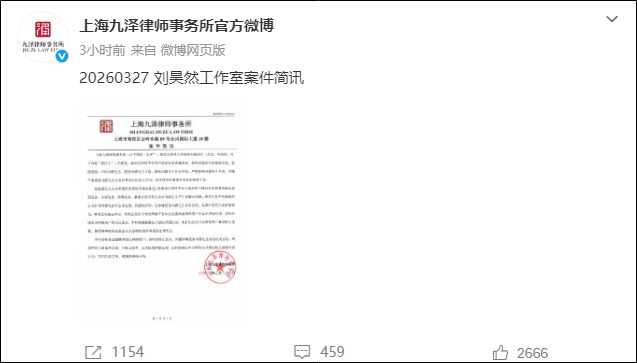 @上海九泽律师事务所官方微博发布刘昊然工作室案件简讯:“就相关网络平台用户持续发布涉嫌诽谤、侮辱刘源先生的侵权信息,意图诋毁、中伤刘源先生,贬损刘源先生人格,降低刘源先生社会评价,严重影响刘源先生名誉,涉嫌严重侵害刘源先生名誉权等合法权益之行为,进行侵权证据保全及诉讼维权工作。”