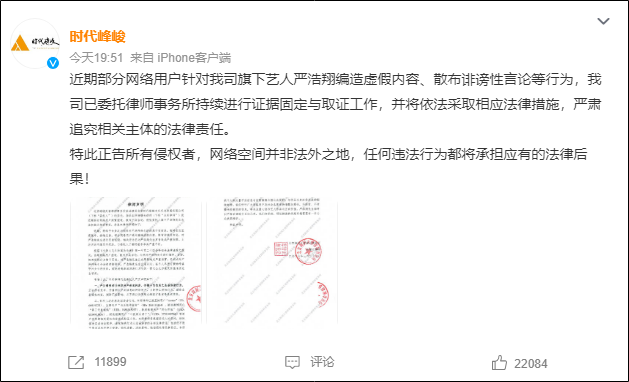 27日晚,@时代峰峻官方微博发布律师声明: