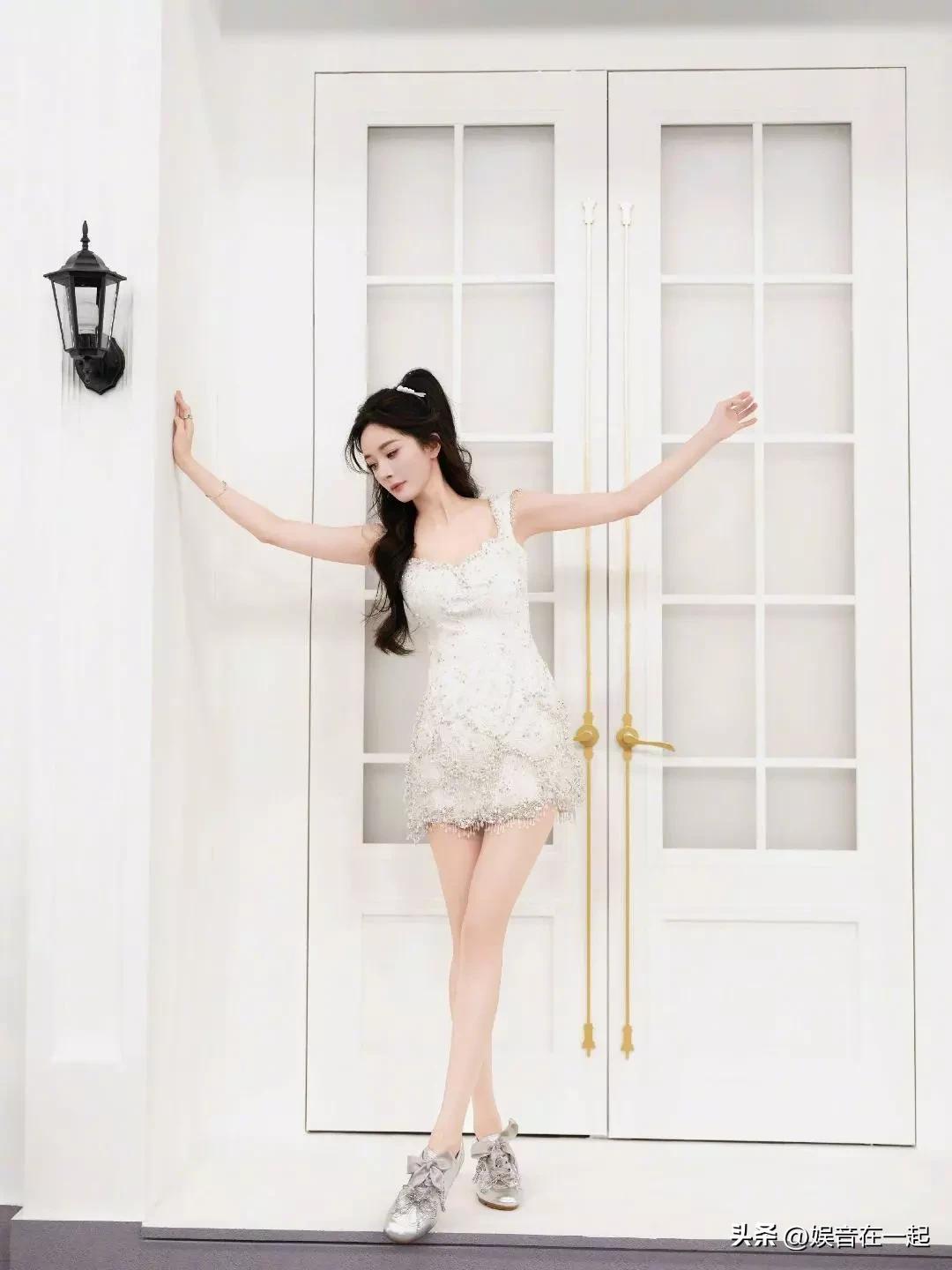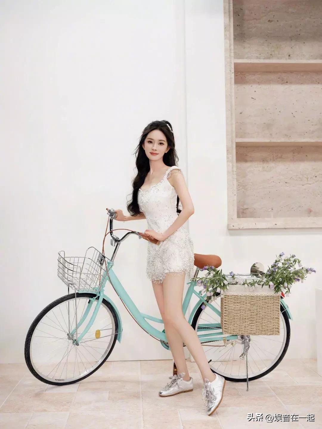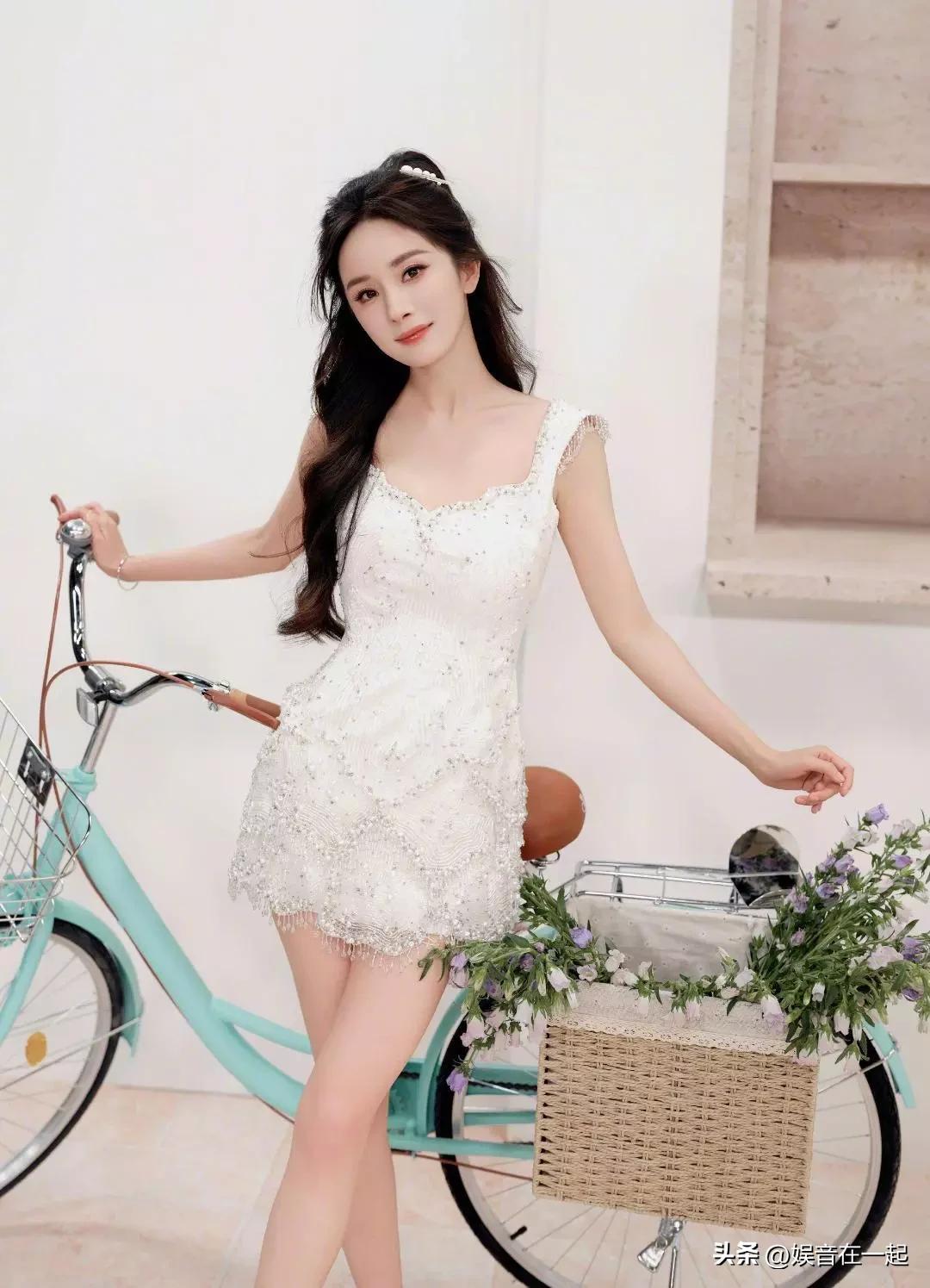 杨幂又美出新高度啦!27日她的最新写真美照曝光,化身单车少女,俏皮灵动得不行。她穿的那条珍珠流苏连衣裙超亮眼,大方秀出纤细美腿,简直魅力爆棚。 照片里的杨幂绽放着甜美笑容,少女感满溢。她身材苗条,美腿又细又长,推着单车出行元气满满。五官精致的她,美貌十分养眼,身姿曼妙,曲线迷人。一袭白色珍珠流苏超短裙,像只优雅的白天鹅,青春无敌又好撩好欲,这状态真让人羡慕!