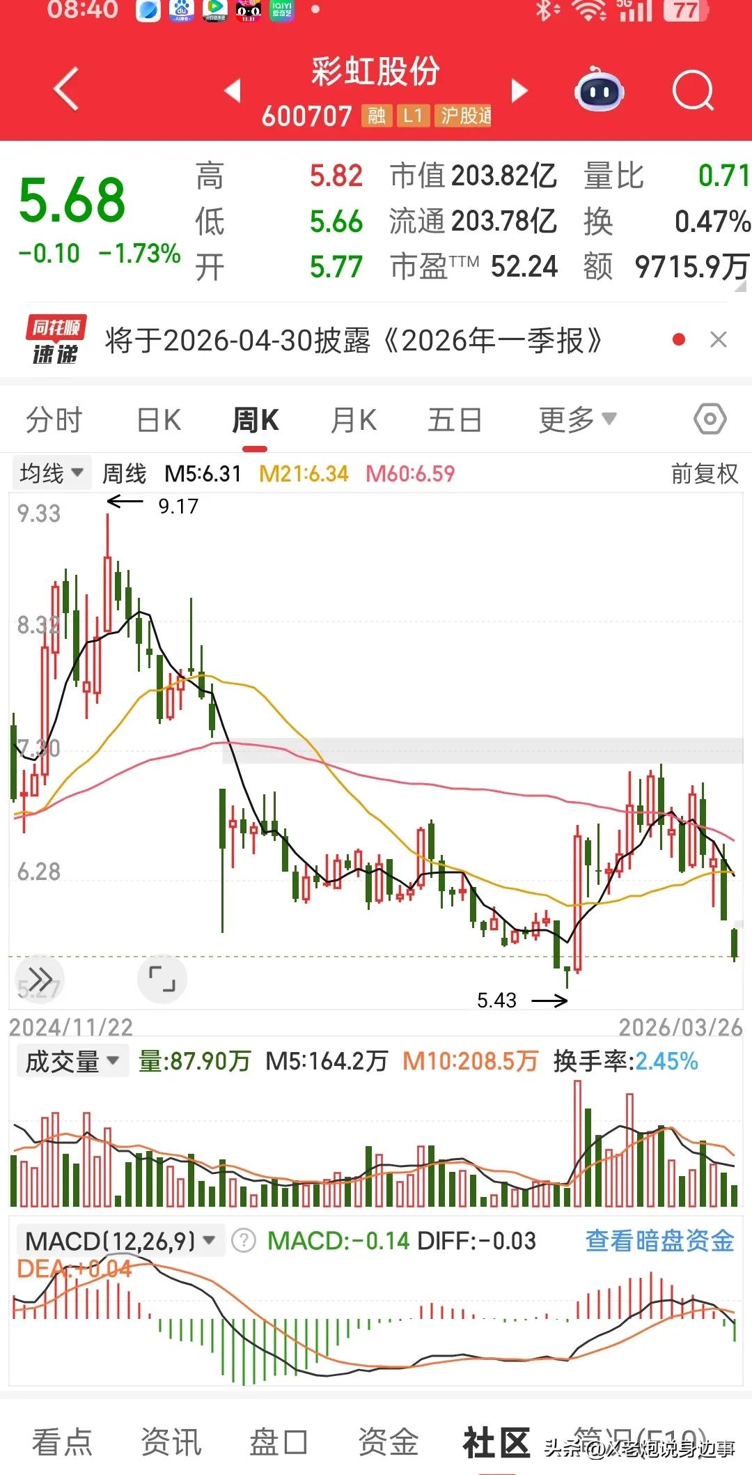 我朋友张浩,20万全仓彩虹股份,从8块套到5块,成功躲过牛市… 唉,跟大伙唠唠我朋友张浩这糟心事,炒股炒得我都替他憋屈死了! 去年年底,他听群里人瞎忽悠,说彩虹股份要起飞,脑子一热,20万本金,8块多全仓梭哈进去了。那时候股价还往上蹦跶,最高摸到9块3,他天天跟我嘚瑟,说自己眼光准,马上要翻倍,连以后换啥车都想好了。 结果呢?行情说变脸就变脸,从9块多一路往下砸,中间连个像样的反弹都没有,整整跌了一年多!别人的票都在牛市里翻几倍涨,他这彩虹股份倒好,不涨反跌,一路阴跌,从8块多跌到现在5块6,前几天还摸到5块4的新低,简直没谁了。 我给他算了笔账: 20万本金,8块多买的,现在股价5块68,每股亏了2块6多,亏了快32%!现在账户里就剩13万6千多,直接没了6万3千块!要是按最低点5块43算,最多只剩13万出头,亏得更狠。 我问他慌不慌,他还嘴硬:“没事,长线持有,早晚能涨回来”,可我看他天天盯盘到半夜,烟都抽得比以前勤了,嘴上说不怕,心里比谁都急。 更气人的是,这大半年牛市行情,多少票都翻了倍,他这账号愣是完美躲过了所有上涨,死死套在这只阴跌股里,别人吃肉他挨揍,别人喝汤他站岗,简直是散户反面教材! 昨天我劝他割肉止损,他说“都亏这么多了,割了就真没了,再等等”,可这行情,谁又说得准呢?好好的20万,放银行吃利息都稳当,现在套在里面,连个响都听不到,图啥啊! 真心劝大伙:炒股别满仓,别听风就是雨,像张浩这样,从高点套到低点,想跑都跑不了,牛市都能躲过去,太熬人了! 炒股血泪史 满仓的代价 彩虹股份 散户的无奈 成功躲过牛市