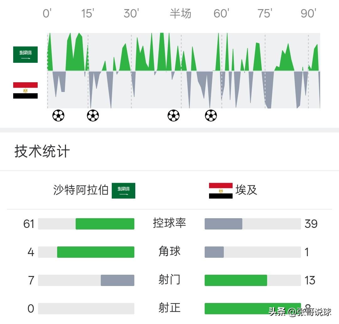沙特0-4埃及,沙特队全场零射正,埃及队8次射正球门范围,沙特没机会,沙特只是控球率占优,没有意义。 联赛搞金元足球,国家队水平就越来越差,和中国男足一样。埃及也不是什么强队,沙特队不该踢成这个水平。