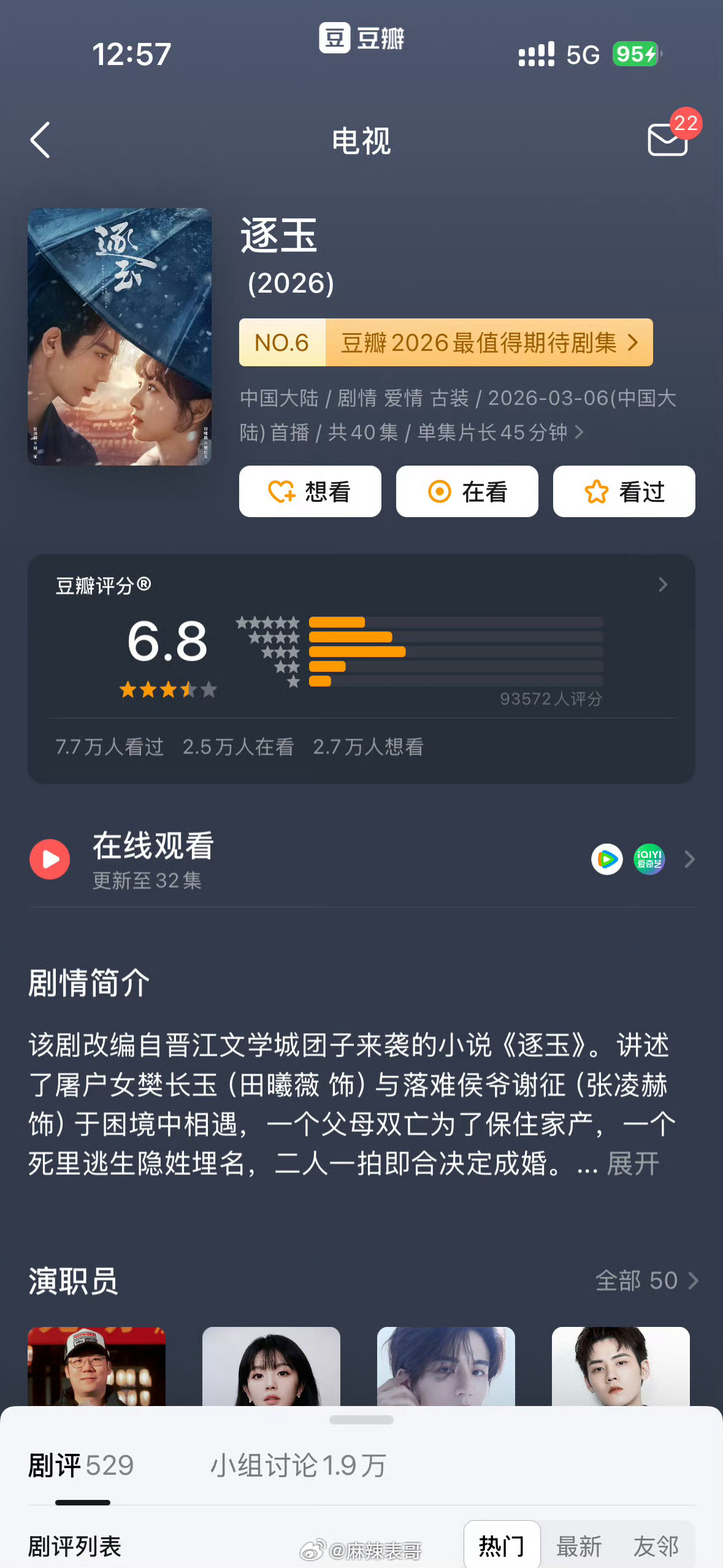 《逐玉》豆瓣开分的时候,只有6.8分,打分人数十万不到,其他爆款都是20万起步粉