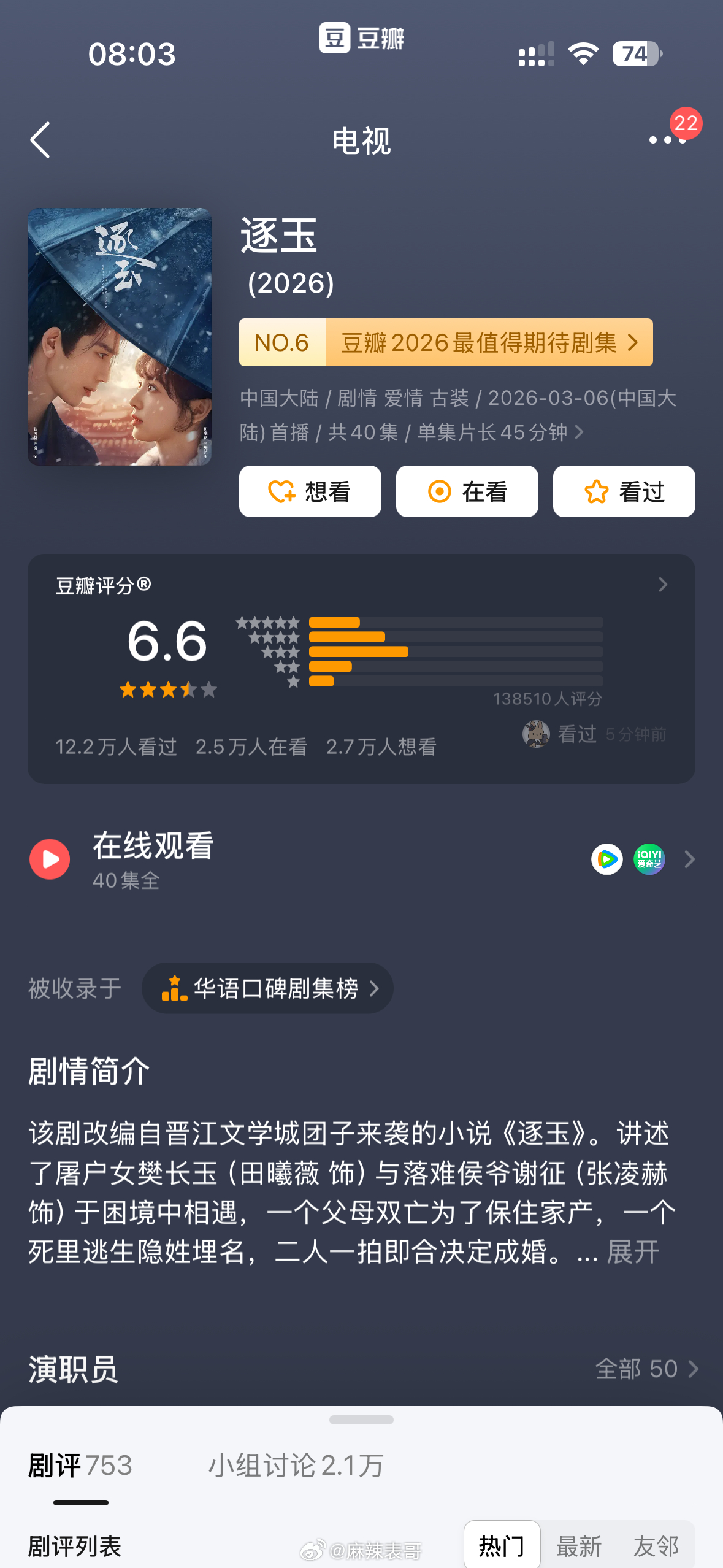 《逐玉》豆瓣开分的时候,只有6.8分,打分人数十万不到,其他爆款都是20万起步粉丝说是打了时间差现在《逐玉》掉到了只有6.6分了,打分人数还是只有13万你们觉得这部剧热度都仅次于《狂飙》了,但破圈的只有“粉底液将军”,走红的也只有没有参演的番外人员何润东,你们觉得问题出在了哪里啊?