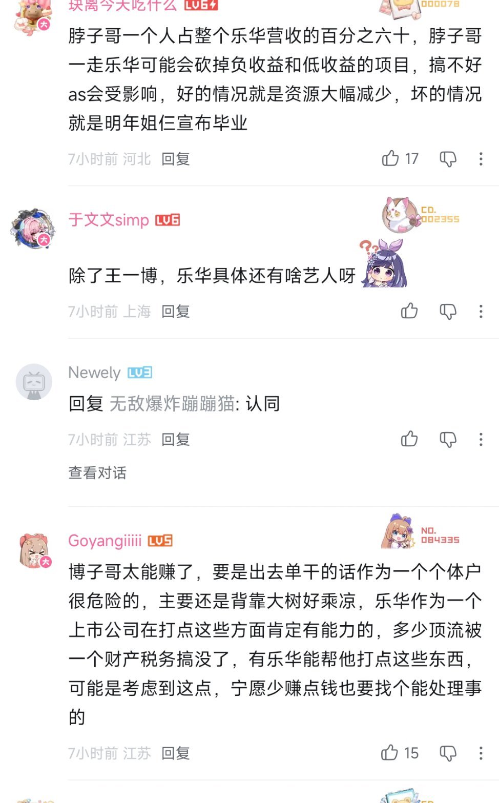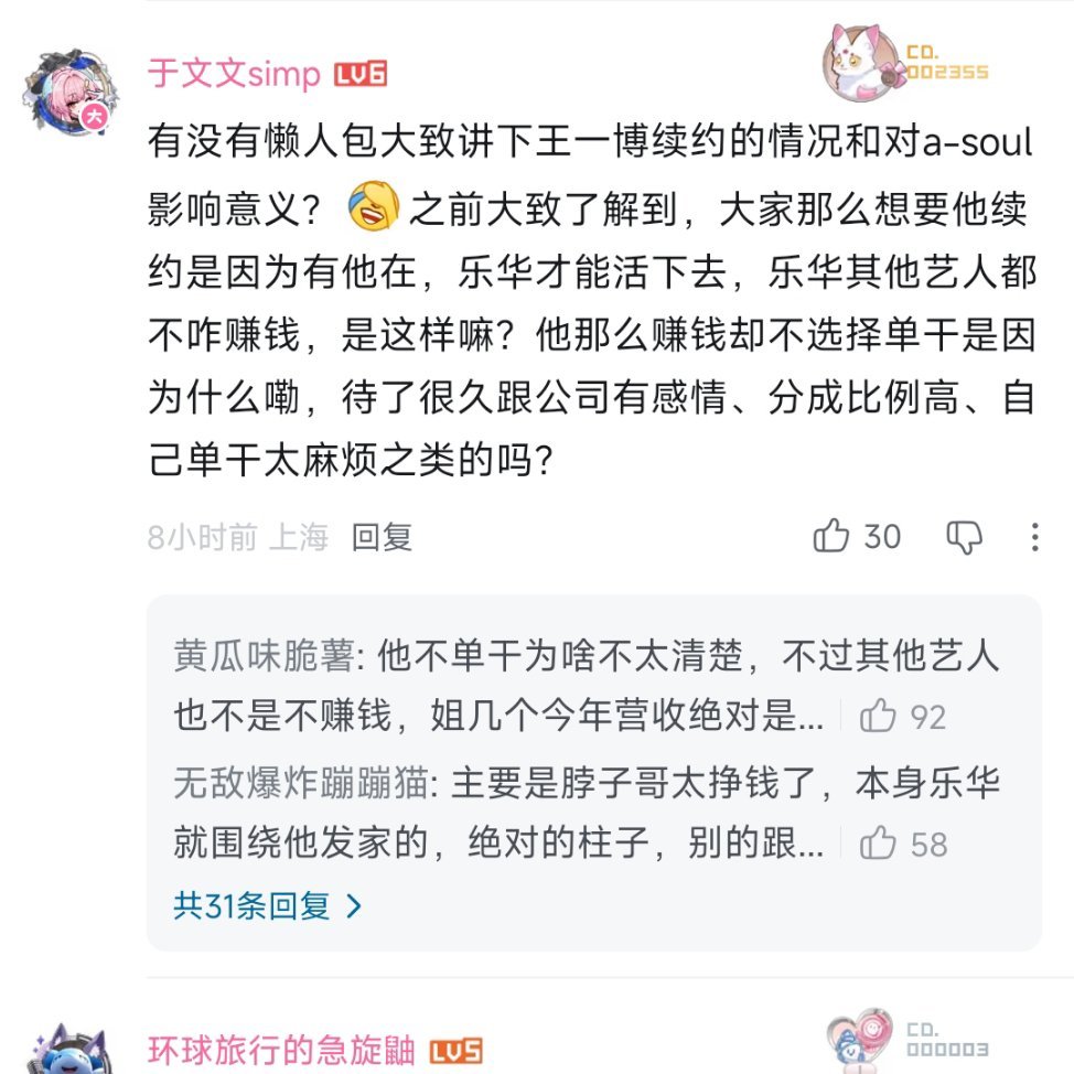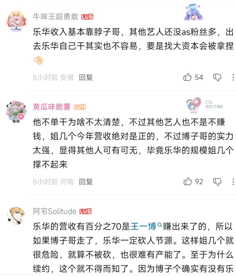 王一博这次和yh有新合作方式后,最高兴的还有一群人,你们绝对猜不到,就是a-u二次元那帮人(我故意没打全名)。他们从去年开始就一直担心,要是博哥走了,自己喜欢的人物会不会因为yh撑不下去被卖掉,所以一直都在等,看他到底走不走,那些跟博相关的招股书,全被他们研究透了的,昨天新的合作方式确定下来之后,字母站上关于王一博的消息,全是他们发的,全在庆祝,说有救了,还在用王一博粉丝都方式发绿色星星有时候想想,一个人到了王一博这个位置,一个举动,能牵动太多事、太多人了,觉得好🐮好神奇。 (还有太多图了,我根本截不完)