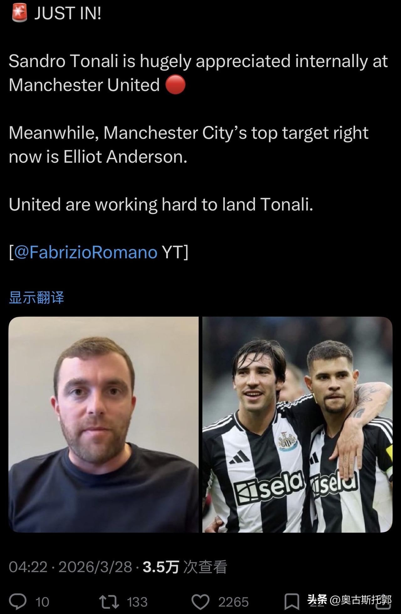 还记不记得去年夏天,曼联转会的宗旨? 不主动想加盟的,曼联就不做舔狗! 你们就不怕: 托纳利想回意大利,米兰想签他。 他今年夏天加盟曼联。 然后拿着高工资,摆烂1年,明年米兰就能白票[捂脸] ………………………………………………………… 突发新闻: 桑德罗·托纳利想要重返意大利,但目前我认为不太可能,因为他的转会费很高。 我仍然坚信托纳利终有一天会重返意大利。或许不是今年夏天,但将来一定会。