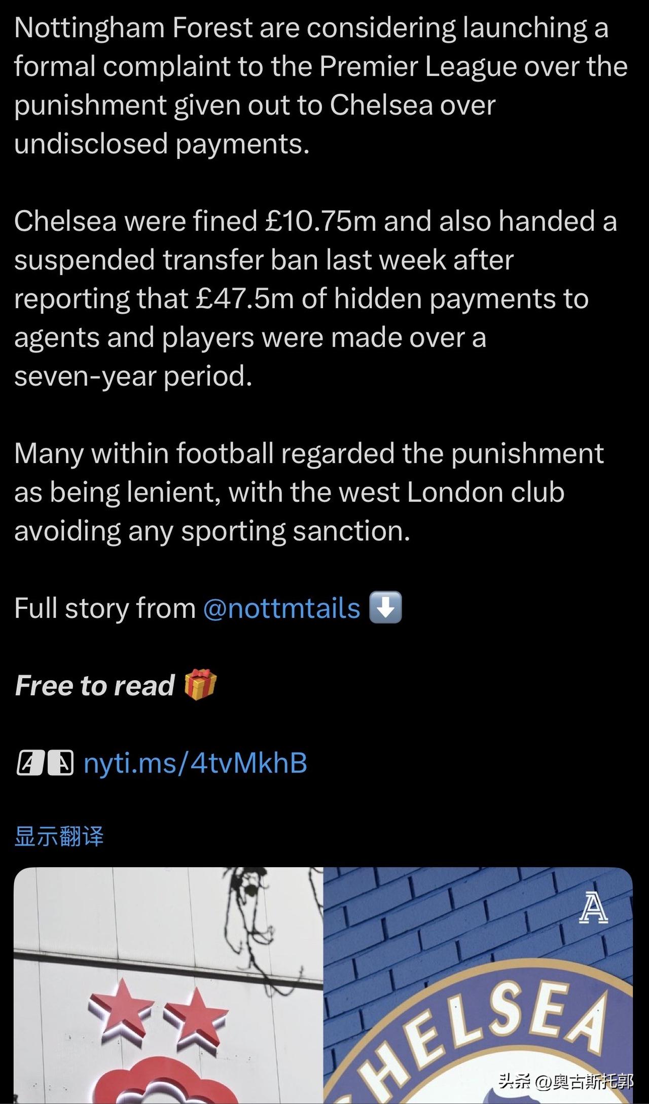 森林这是给自己降级可能做保险? 问题现在申诉也来不及了吧。 现在一堆媒体,说切尔西这次违规,处罚太轻了。 ……………………………………………………………… 诺丁汉森林队正在考虑就英超联赛对切尔西因未公开付款而受到的处罚向英超联赛提出正式申诉。 上周,切尔西俱乐部因在七年间向经纪人和球员支付了 4750 万英镑的隐性款项而被罚款 1075 万英镑,并被处以缓期执行的转会禁令。 许多足球界人士认为处罚过轻,这家位于伦敦西部的俱乐部避免了任何体育制裁。