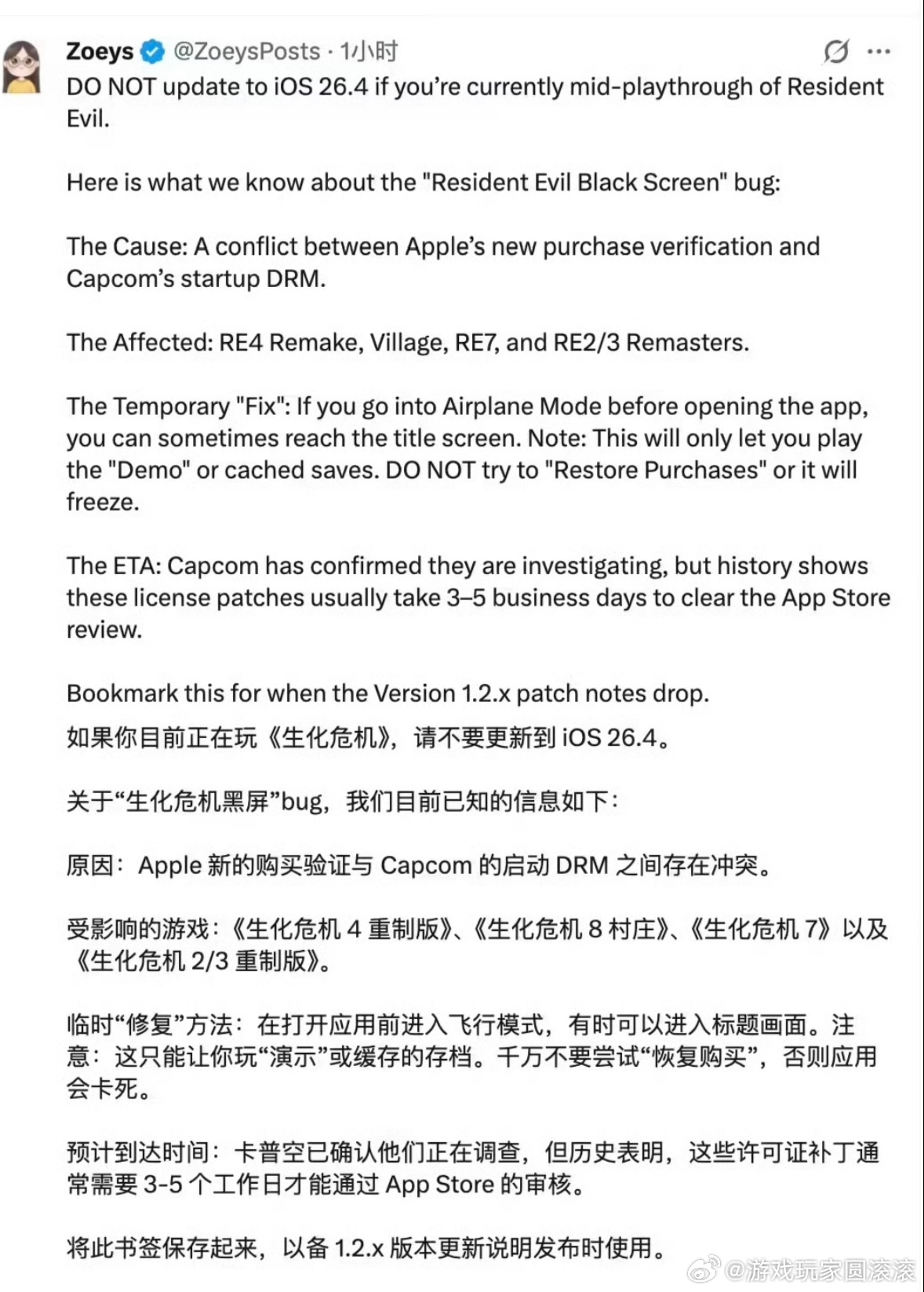 iOS26.4导致生化危机游戏崩溃iOS版生化危机崩溃生化危机 2026年3月27日,《生化危机》官方已发布公告确认:所有iOS平台的《生化危机》系列游戏,在设备升级至iOS 26.4系统后,都会出现无法正常加载、启动崩溃、黑屏等问题,目前官方已启动专项调查,修复完成后会第一时间公布进展。受影响的游戏包括《生化危机4 重制版》《生化危机8 村庄》《生化危机7》《生化危机2/3 重制版》等全系列iOS版本。本次崩溃的核心原因,是iOS 26.4中苹果新引入的购买验证机制,与卡普空游戏的启动DRM(数字版权管理)系统发生冲突,导致游戏在启动授权校验环节直接失败,无法正常进入游戏。临时解决方案(有功能限制)在官方修复补丁发布前,仅可通过以下方式临时缓解,无法完全解决问题: