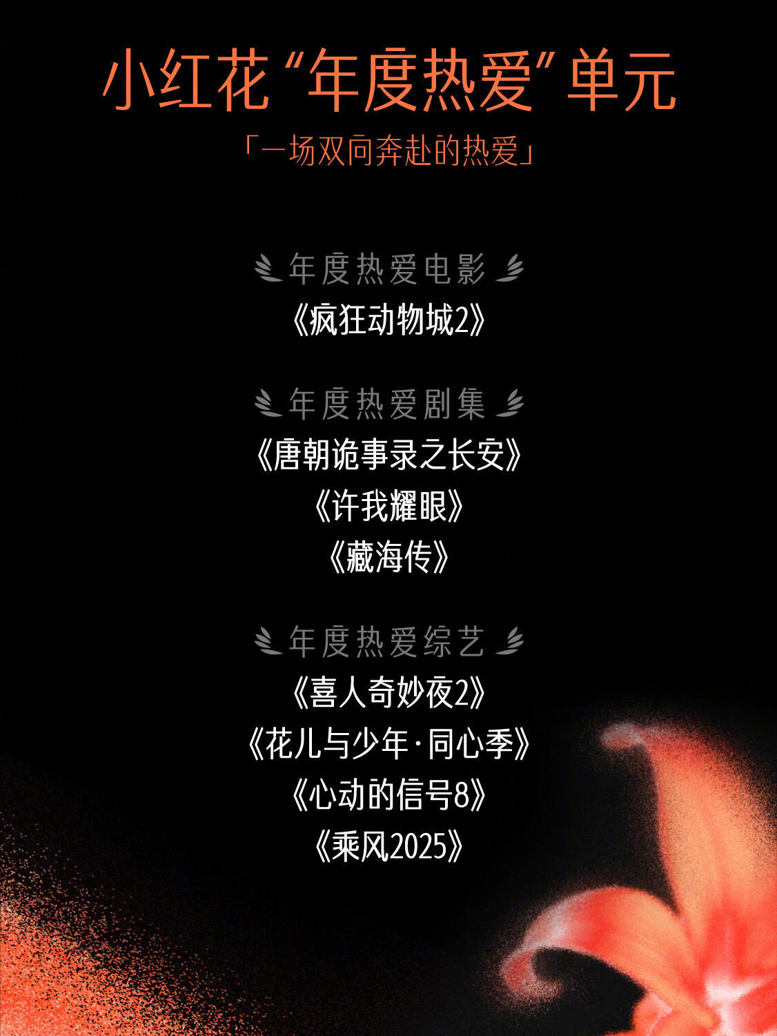 「小🍠影视风向标作者」年度十佳小红花“年度热爱"单元年度热爱电影《疯狂动物城2》年度热爱剧集《唐朝诡事录之长安》《许我耀眼》《藏海传》年度热爱综艺《喜人奇妙夜2》《花儿与少年·同心季》《心动的信号8》《乘风2025》