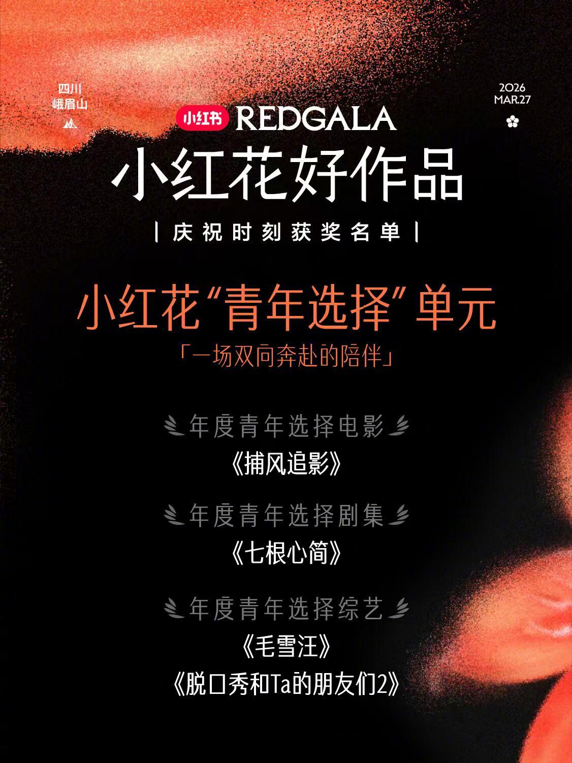 小红花"青年选择”单元年度青年选择电影《捕风追影》年度青年选择剧集《七根心简》年度青年选择剧集综艺《毛雪汪》《脱口秀和Ta的朋友们2》