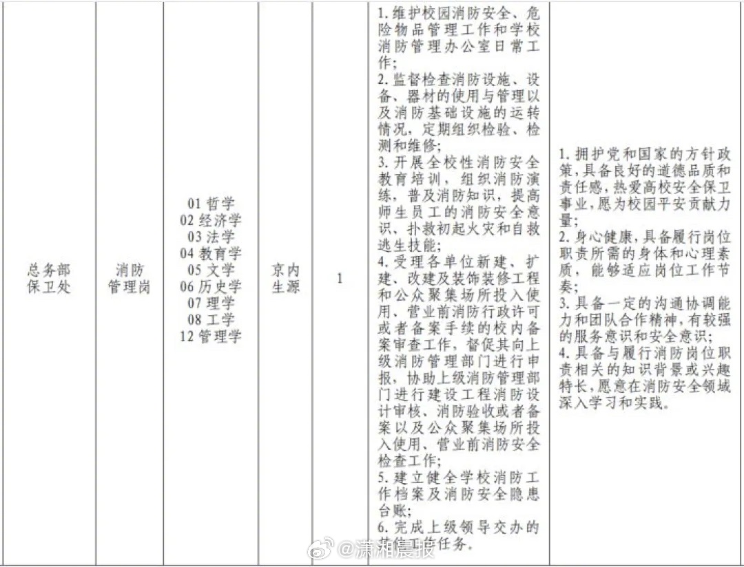 【#北师大招消防管理编制要求应届硕士#,#高校回应招消防管理事业编要求硕士#:不是“六边形保安战士”】近日,北师大保卫处的一则招聘广告引发关注:消防管理岗招1人,有编制,从事校园消防安全等工作,要求是京内生源、应届硕士等。很多网友表示,该岗位是否为消防员、需不需要去救火等等。3月20日,北师大官网发布招聘启事,面向应届毕业生招聘事业编制管理岗位人员,一共招2人,其中之一为该岗位。招聘有笔试、面试、政审等环节。3月25日,该校保卫处账号在社交平台发布该岗位招聘广告,引发网友热议。3月28日,该校人才人事部工作人员告诉记者,“消防管理岗”的职责启事里有详细介绍,“它应该不是招专业消防员,而是做消防管理工作。”具体情况要咨询保卫处。随后,记者致电该校保卫处,电话未通。据现代快报,该校保卫处工作人员表示,该岗位并非部分网友认为的保安。记者注意到,该校保卫处账号在社交平台也回复了网友,“不是六边形保安战士,欢迎大家投简历。”潇湘晨报·晨视频记者於广强 北京